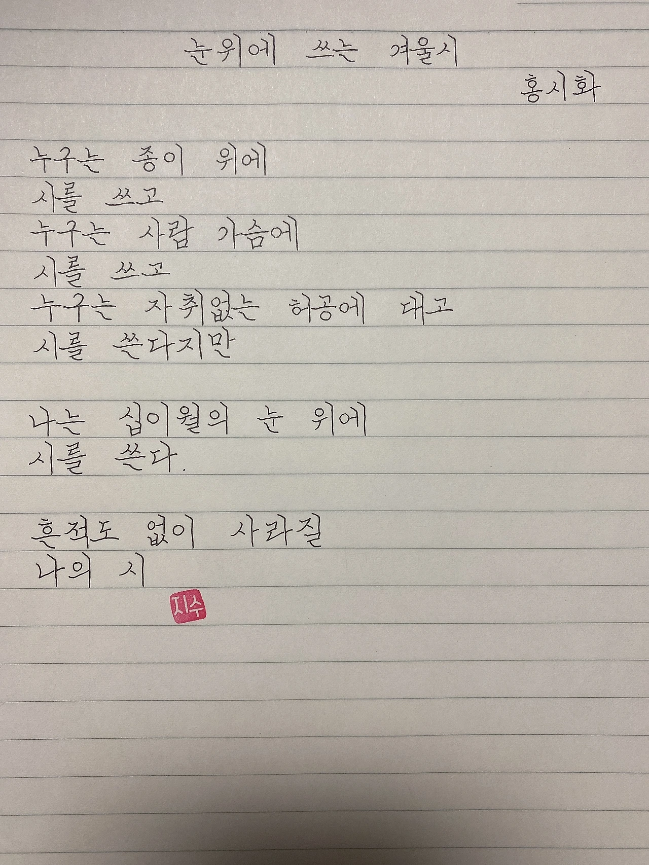 평범한 직장인. 사내 동호회를 통해 매일 한편 손으로 시 읽기를 시작한 이후로, 매일 시 한편을 필사 합니다. 필사한 시가 저작권에 문제가 된다면 말씀해주세요.