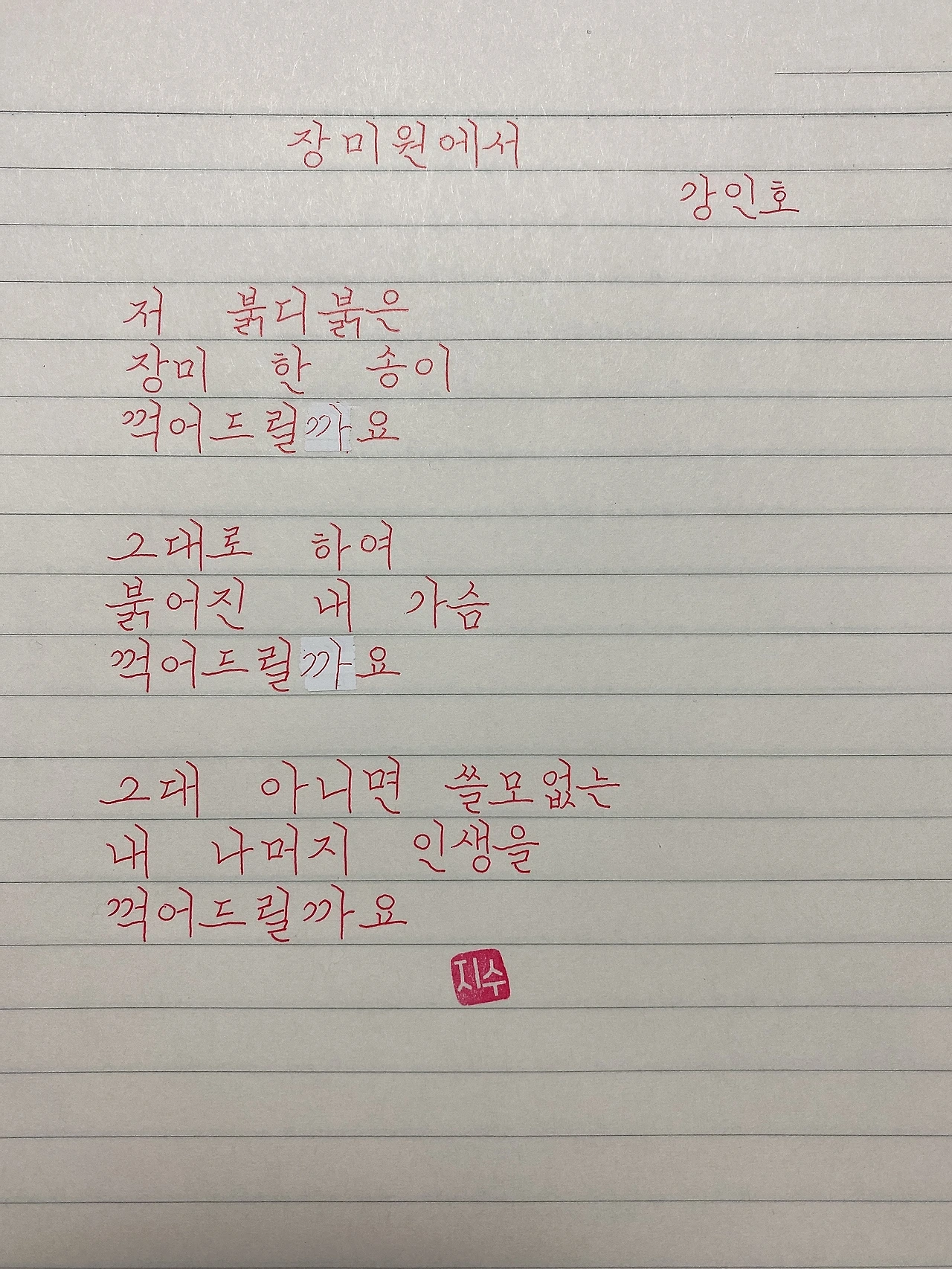 평범한 직장인. 사내 동호회를 통해 매일 한편 손으로 시 읽기를 시작한 이후로, 매일 시 한편을 필사 합니다. 필사한 시가 저작권에 문제가 된다면 말씀해주세요.