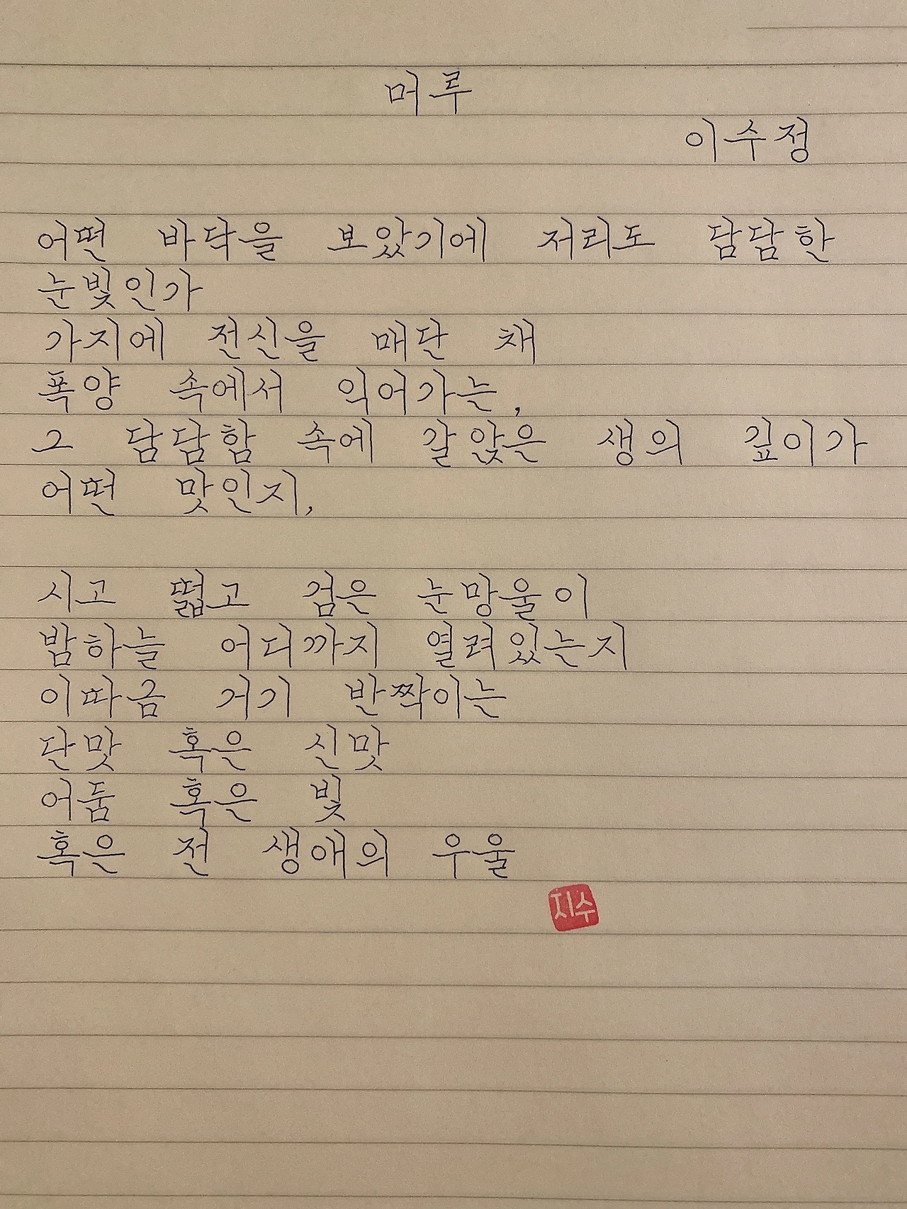 평범한 직장인. 사내 동호회를 통해 매일 한편 손으로 시 읽기를 시작한 이후로, 매일 시 한편을 필사 합니다. 필사한 시가 저작권에 문제가 된다면 말씀해주세요.