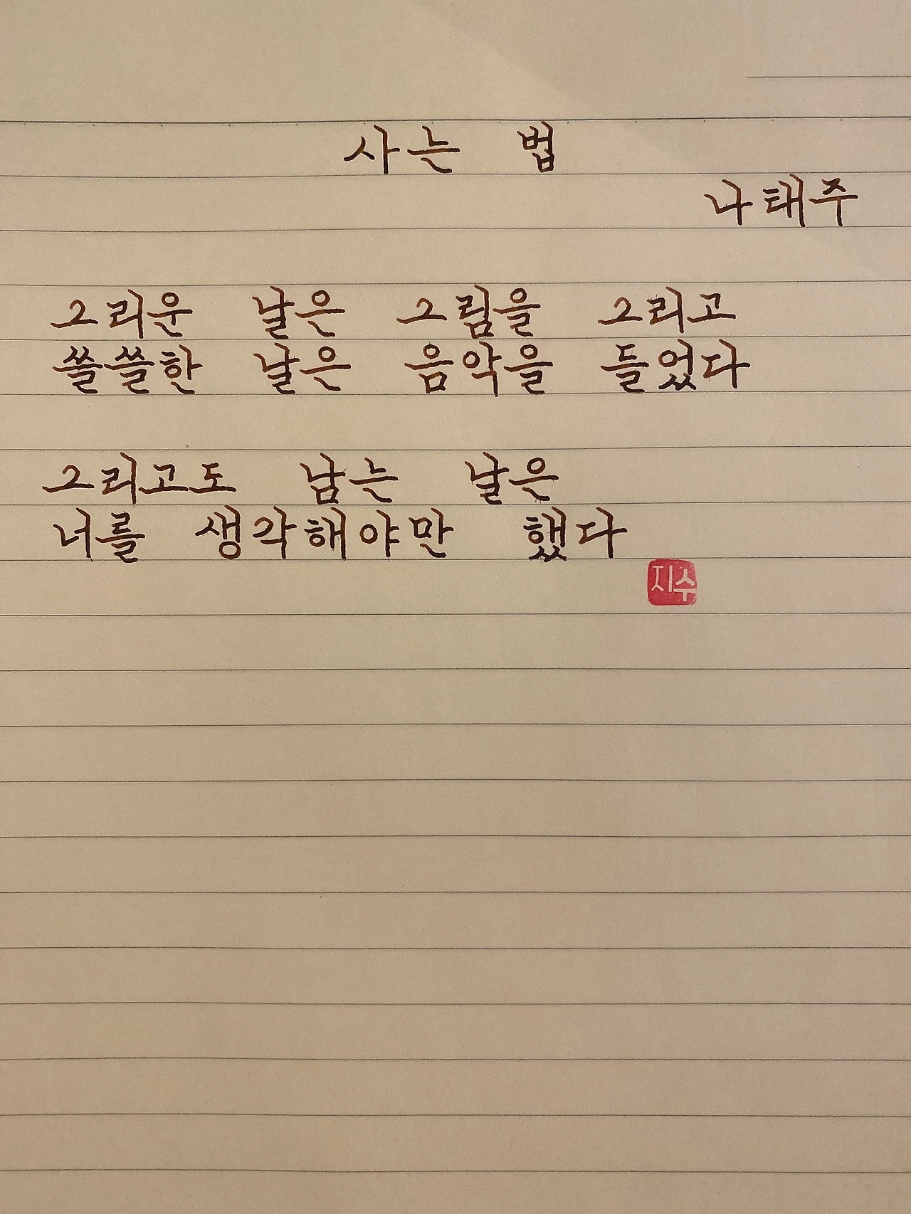 평범한 직장인. 사내 동호회를 통해 매일 한편 손으로 시 읽기를 시작한 이후로, 매일 시 한편을 필사 합니다. 필사한 시가 저작권에 문제가 된다면 말씀해주세요.