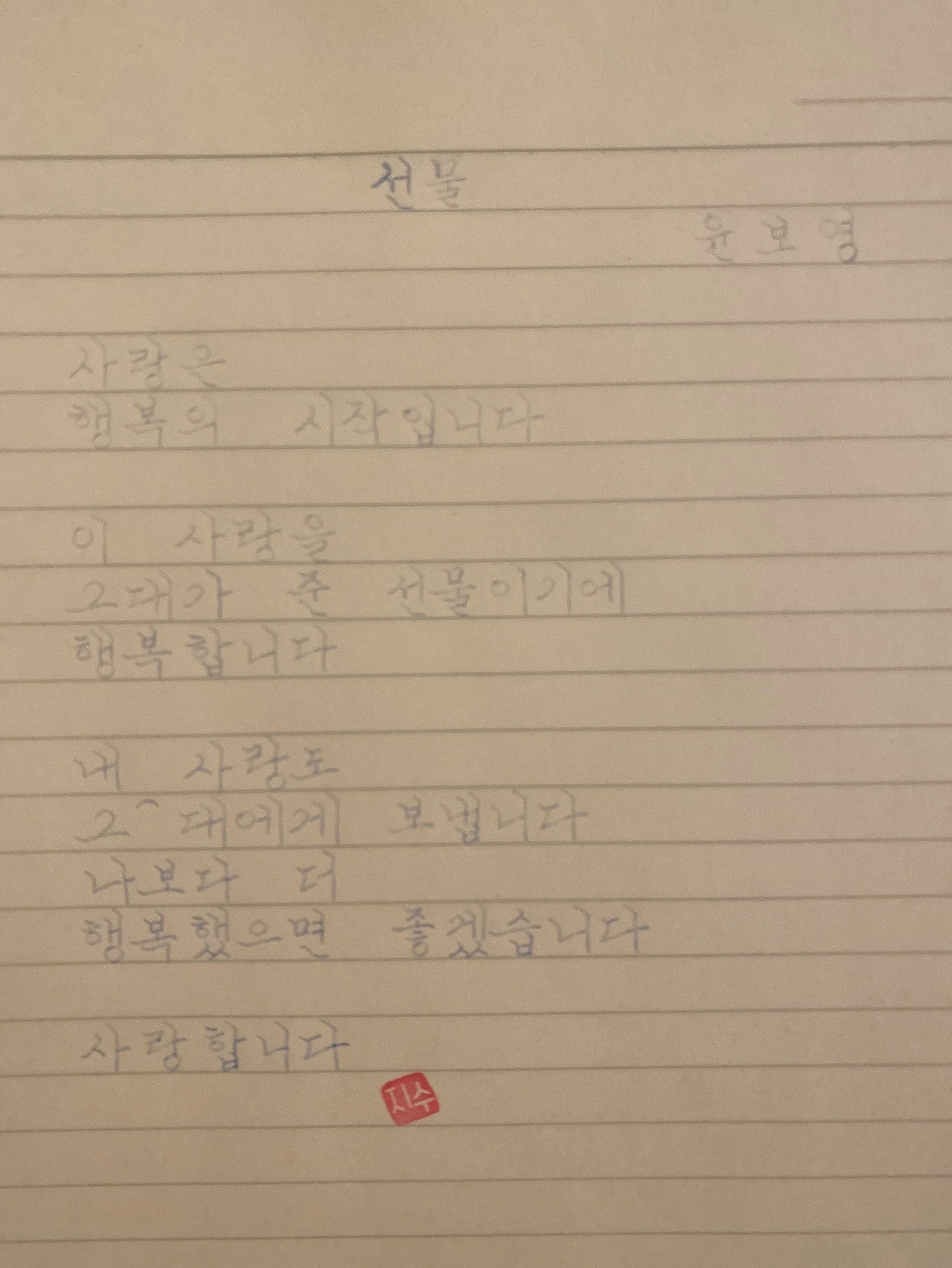선물 by 윤보영사랑은행복의 시작입니다이 사랑을그대가 준 선물이기에행복합니다내 사랑도그대에게 보냅니다나보다 더행복했으면 좋겠습니다사랑합니다
