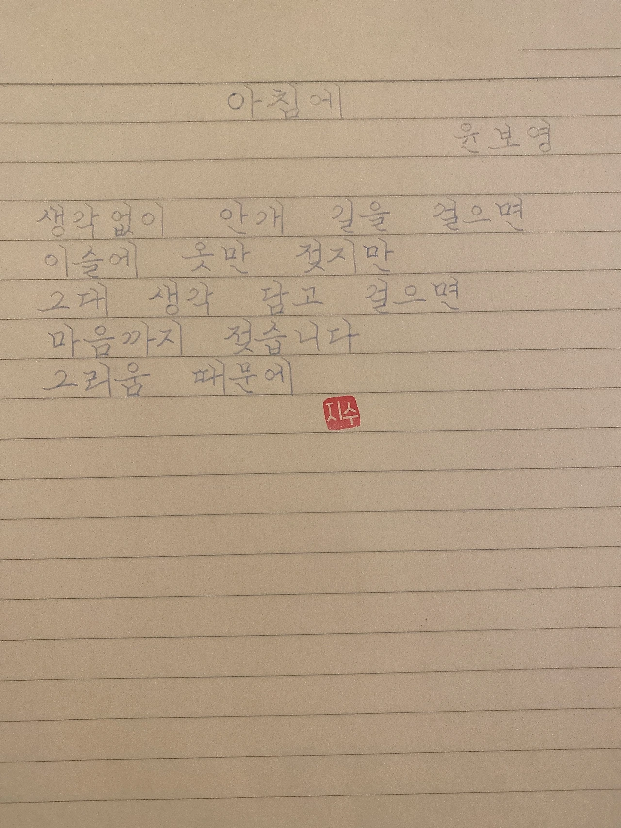 평범한 직장인. 사내 동호회를 통해 매일 한편 손으로 시 읽기를 시작한 이후로, 매일 시 한편을 필사 합니다. 필사한 시가 저작권에 문제가 된다면 말씀해주세요.
