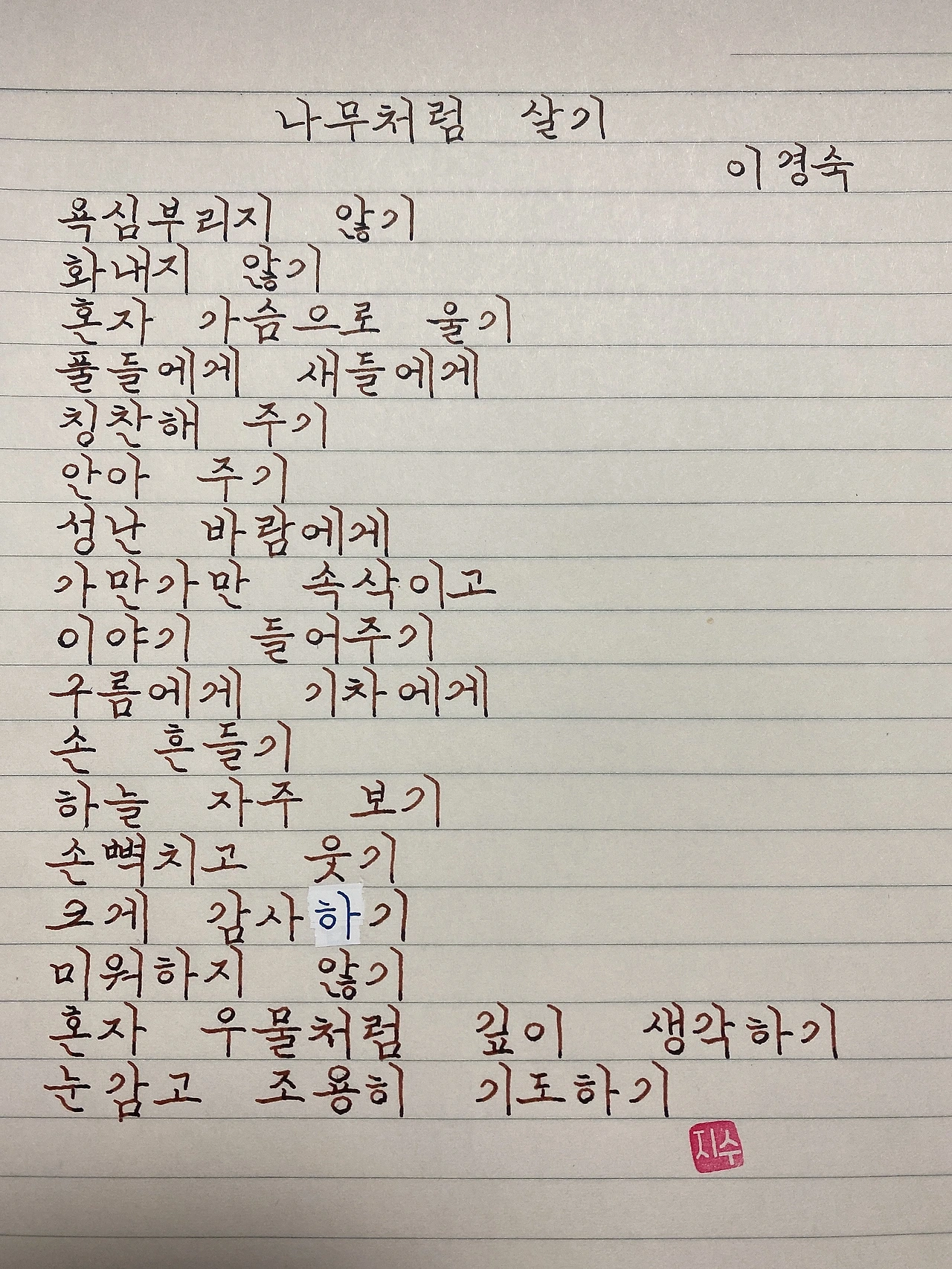 [201219] 나무처럼 살기 / 이경숙욕심부리지 않기화내지 않기혼자 가슴으로 울기풀들에게 새들에게칭찬해 주기안아 주기성난 바람에게가만가만 속삭이고이야기 들어주기구름에게 기차에게손 흔들기하늘 자주 보기손뼉치고 웃기크게 감사하기미워하지 않기혼자 우물처럼 깊이 생각하기눈감고 조용히 기도하기