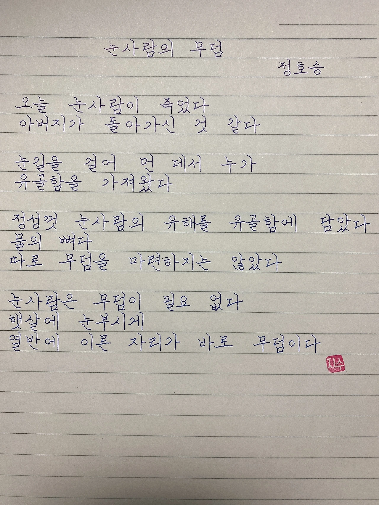 평범한 직장인. 사내 동호회를 통해 매일 한편 손으로 시 읽기를 시작한 이후로, 매일 시 한편을 필사 합니다. 필사한 시가 저작권에 문제가 된다면 말씀해주세요.