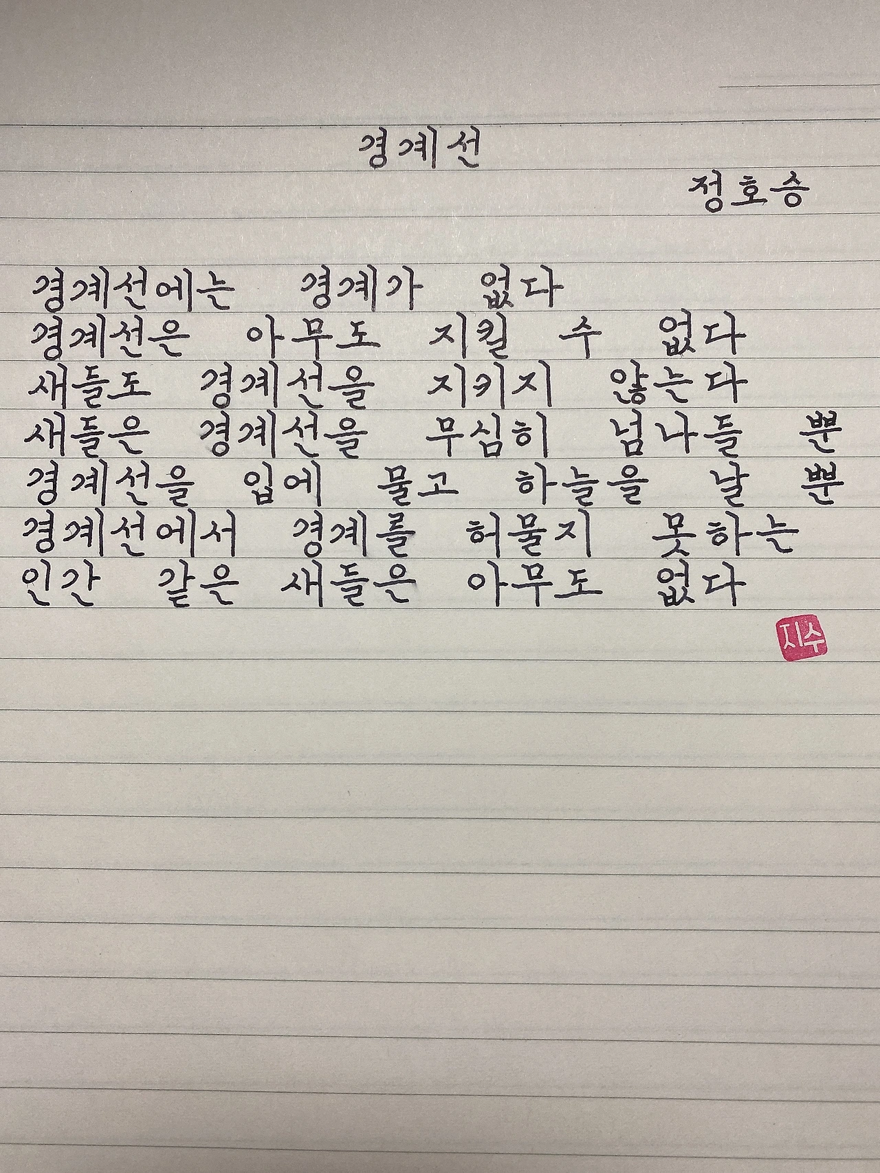경계선경계선에는 경계가 없다경계선은 아무도 지킬 수 없다새들도 경계선을 지키지 않는다새들은 경계선을 무심히 넘나들뿐경계선을 입에 물고 하늘을 날 뿐경계선에서 경계를 하물지 못하는인간 같은 새들은 아무도 없다
