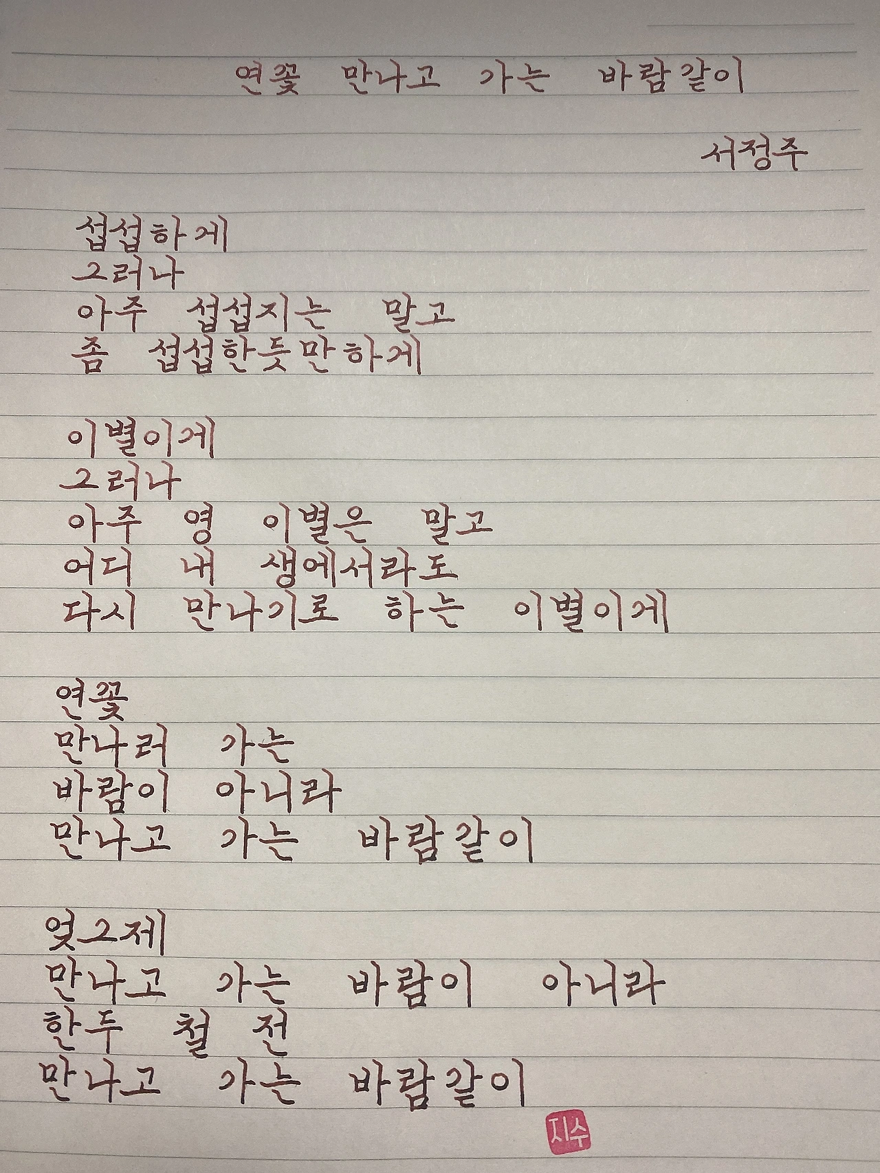 평범한 직장인. 사내 동호회를 통해 매일 한편 손으로 시 읽기를 시작한 이후로, 매일 시 한편을 필사 합니다. 필사한 시가 저작권에 문제가 된다면 말씀해주세요.