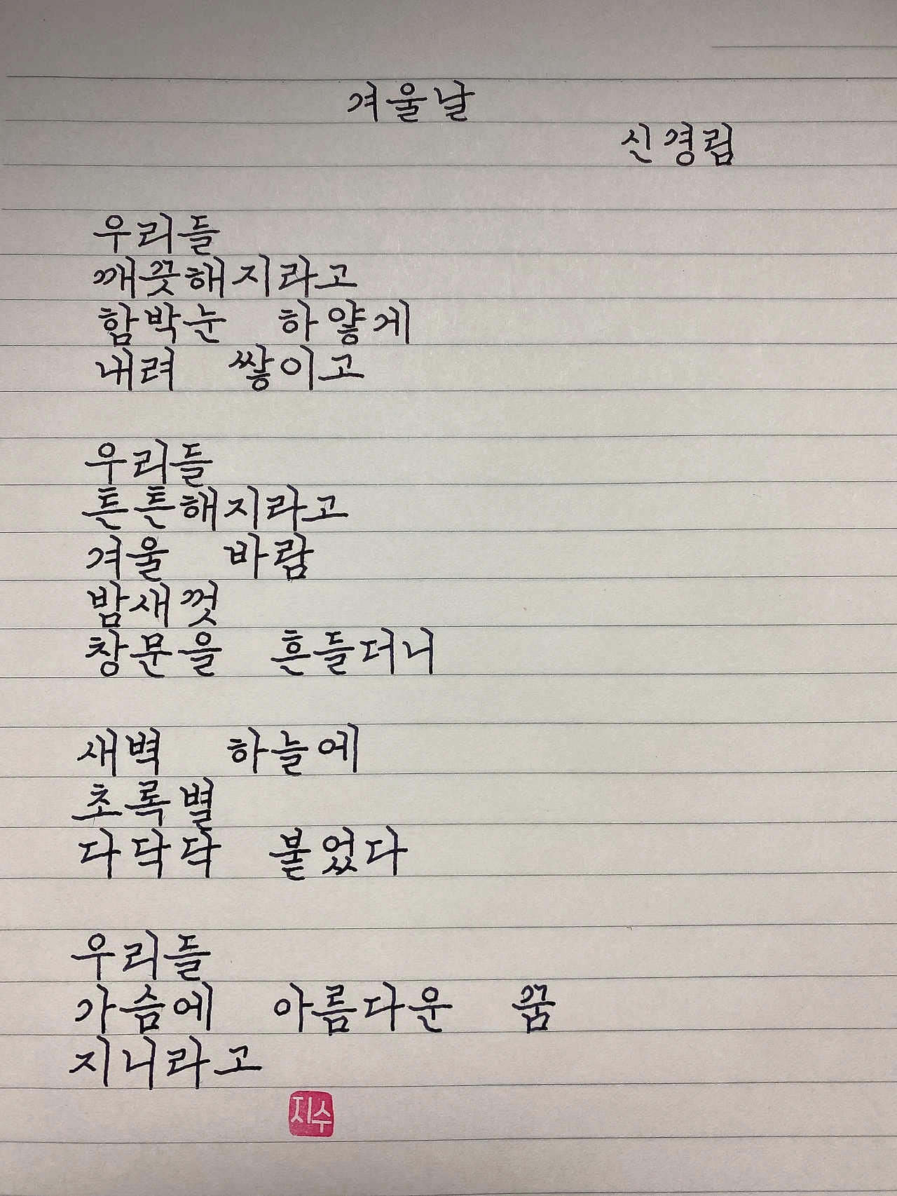 [201227] 겨울날 -신경림-우리들 깨끗해지라고함박눈 하얗게내려 쌓이고우리들 튼튼해지라고겨울 바람밤새껏창문을 흔들더니새벽 하늘에초록별다닥닥 붙었다우리들가슴에 아름다운 꿈지니라고