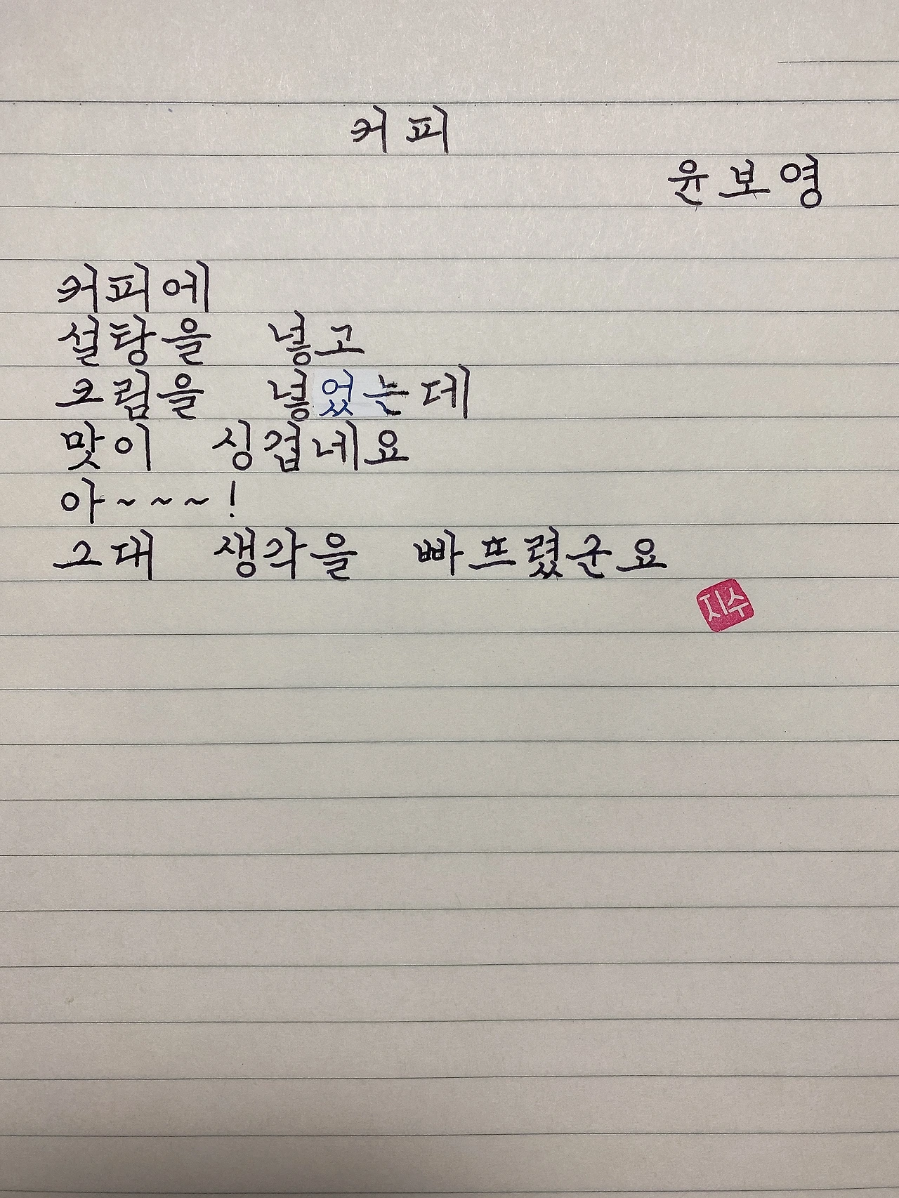 평범한 직장인. 사내 동호회를 통해 매일 한편 손으로 시 읽기를 시작한 이후로, 매일 시 한편을 필사 합니다. 필사한 시가 저작권에 문제가 된다면 말씀해주세요.