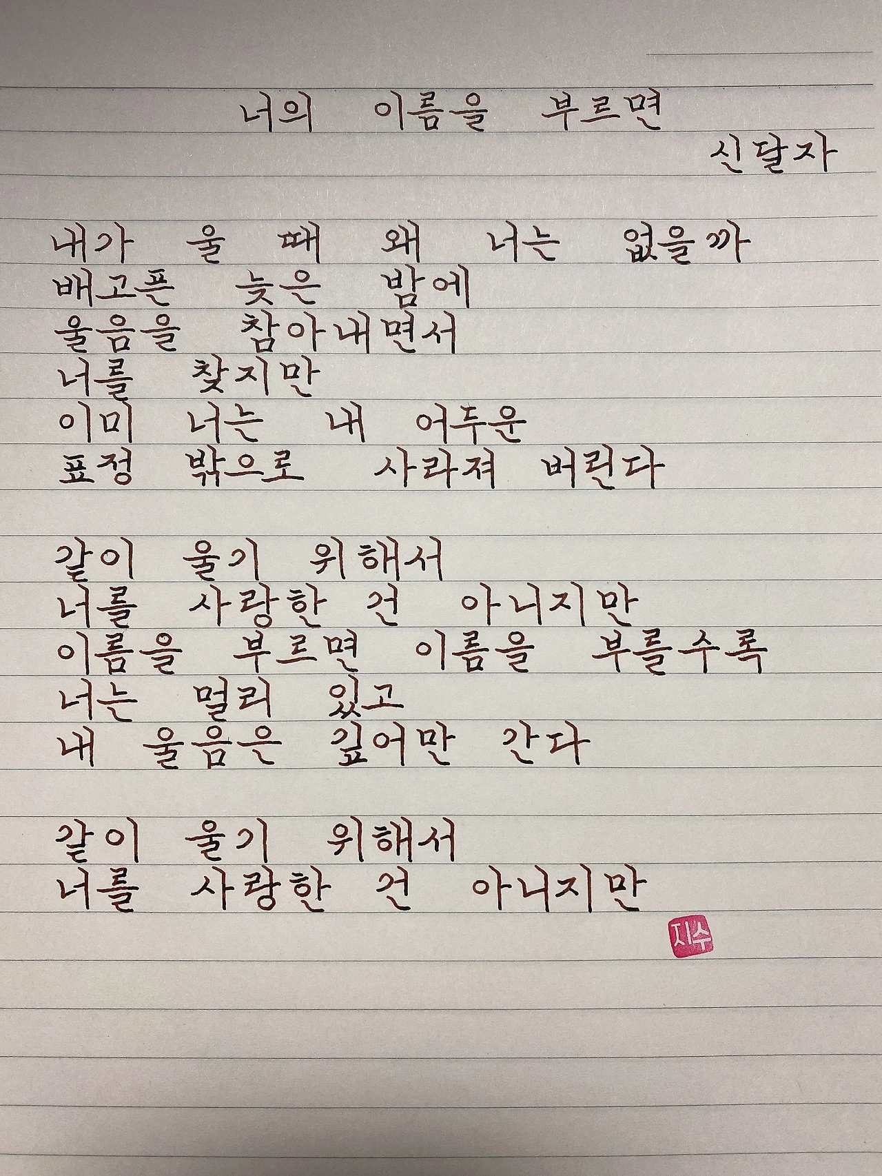 평범한 직장인. 사내 동호회를 통해 매일 한편 손으로 시 읽기를 시작한 이후로, 매일 시 한편을 필사 합니다. 필사한 시가 저작권에 문제가 된다면 말씀해주세요.