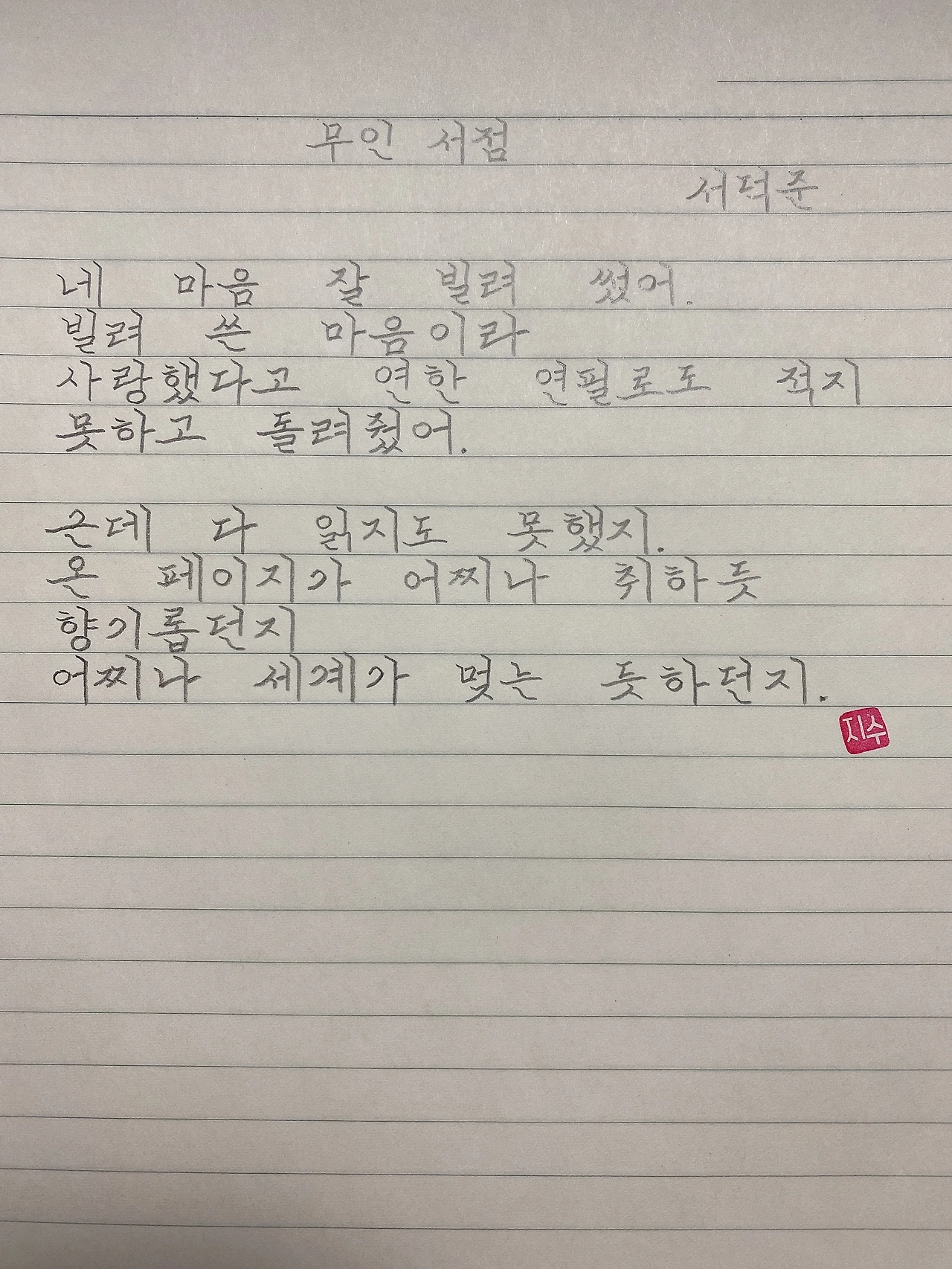 평범한 직장인. 사내 동호회를 통해 매일 한편 손으로 시 읽기를 시작한 이후로, 매일 시 한편을 필사 합니다. 필사한 시가 저작권에 문제가 된다면 말씀해주세요.
