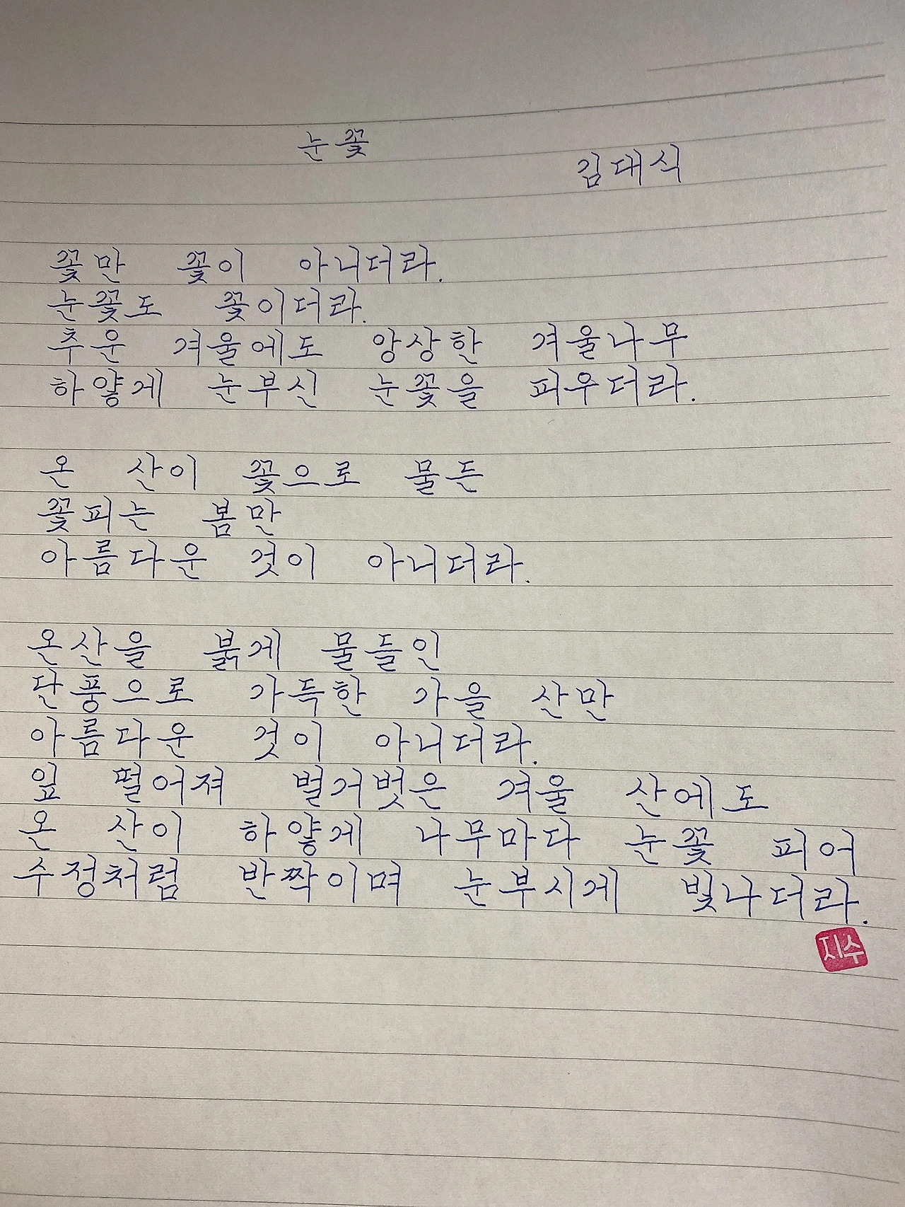 평범한 직장인. 사내 동호회를 통해 매일 한편 손으로 시 읽기를 시작한 이후로, 매일 시 한편을 필사 합니다. 필사한 시가 저작권에 문제가 된다면 말씀해주세요.