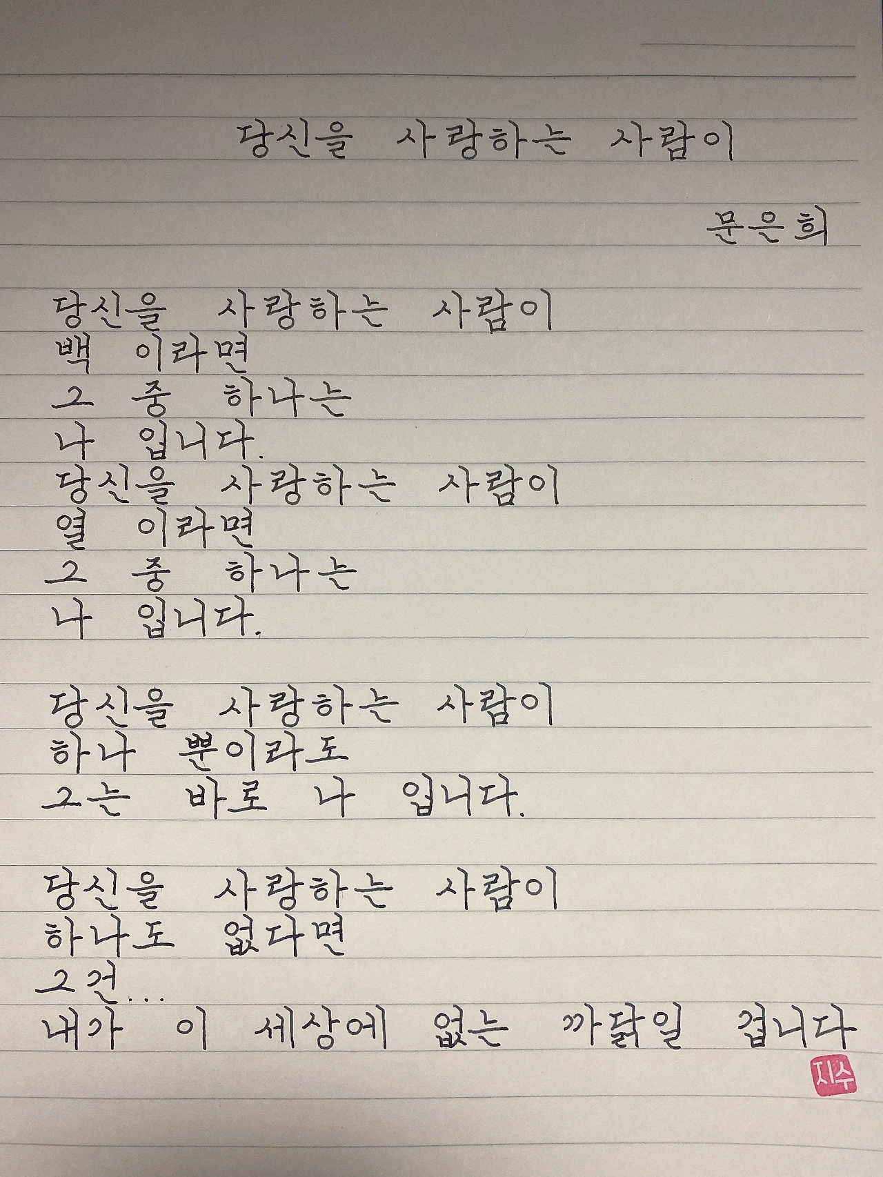평범한 직장인. 사내 동호회를 통해 매일 한편 손으로 시 읽기를 시작한 이후로, 매일 시 한편을 필사 합니다. 필사한 시가 저작권에 문제가 된다면 말씀해주세요.