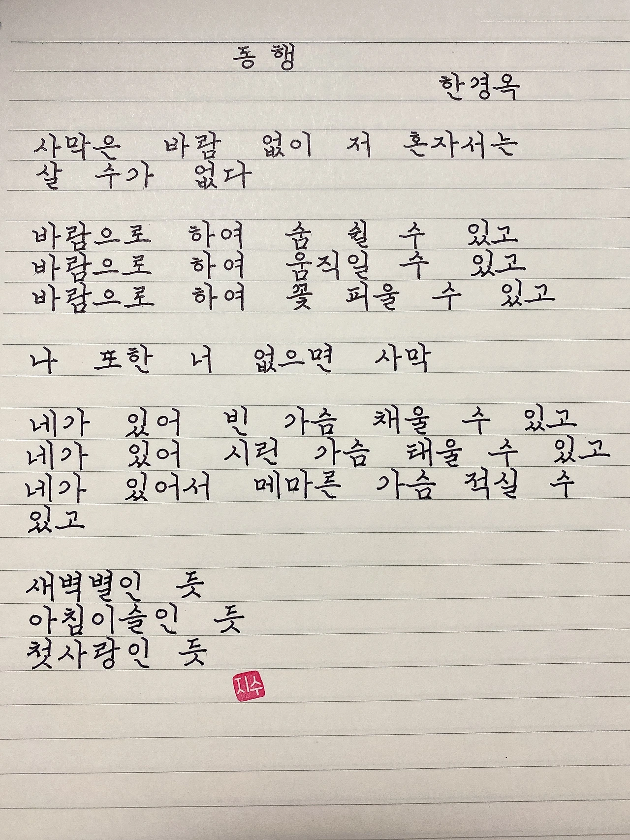 평범한 직장인. 사내 동호회를 통해 매일 한편 손으로 시 읽기를 시작한 이후로, 매일 시 한편을 필사 합니다. 필사한 시가 저작권에 문제가 된다면 말씀해주세요.