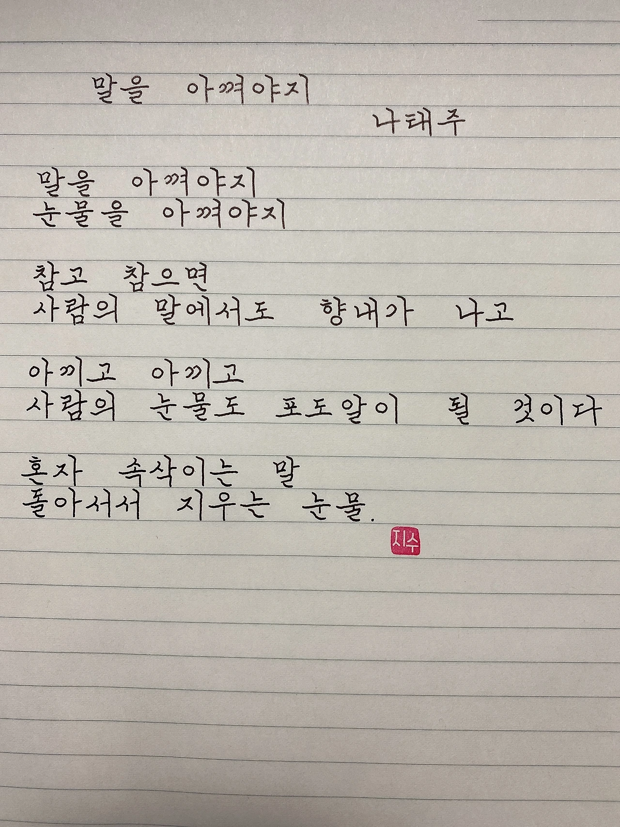 [210220] 말을 아껴야지 by 나태주말을 아껴야지눈물을 아껴야지참고 참으면사람의 말에서도 향내가 나고아끼고 아끼면사람의 눈물도 포도알이 될 것이다혼자 속삭이는 말돌아서서 지우는 눈물.