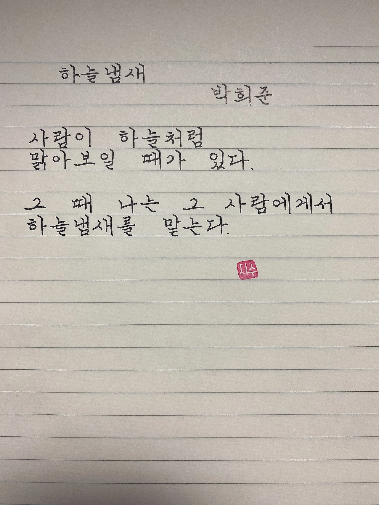 평범한 직장인. 사내 동호회를 통해 매일 한편 손으로 시 읽기를 시작한 이후로, 매일 시 한편을 필사 합니다. 필사한 시가 저작권에 문제가 된다면 말씀해주세요.