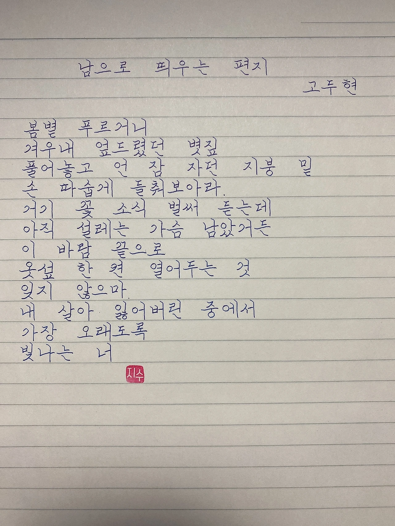 평범한 직장인. 사내 동호회를 통해 매일 한편 손으로 시 읽기를 시작한 이후로, 매일 시 한편을 필사 합니다. 필사한 시가 저작권에 문제가 된다면 말씀해주세요.
