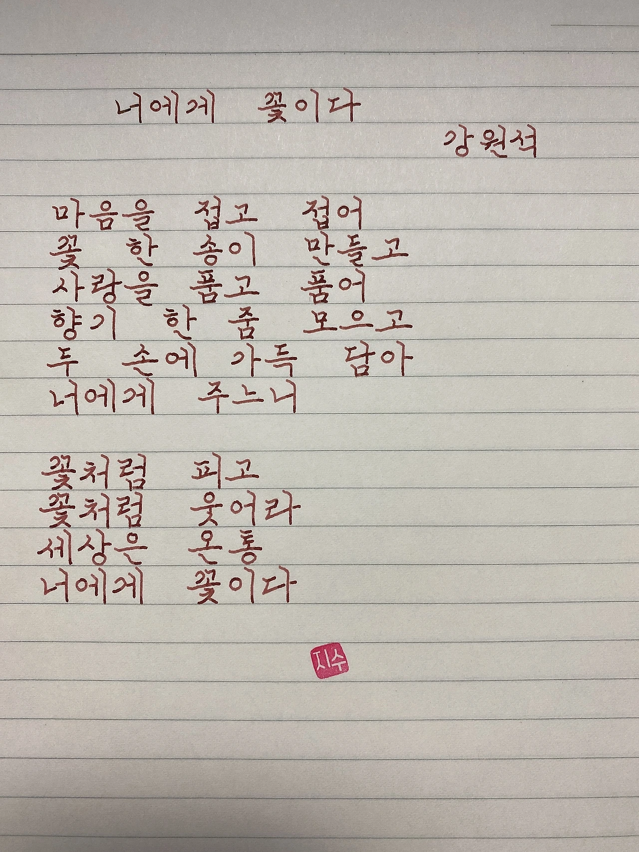 평범한 직장인. 사내 동호회를 통해 매일 한편 손으로 시 읽기를 시작한 이후로, 매일 시 한편을 필사 합니다. 필사한 시가 저작권에 문제가 된다면 말씀해주세요.