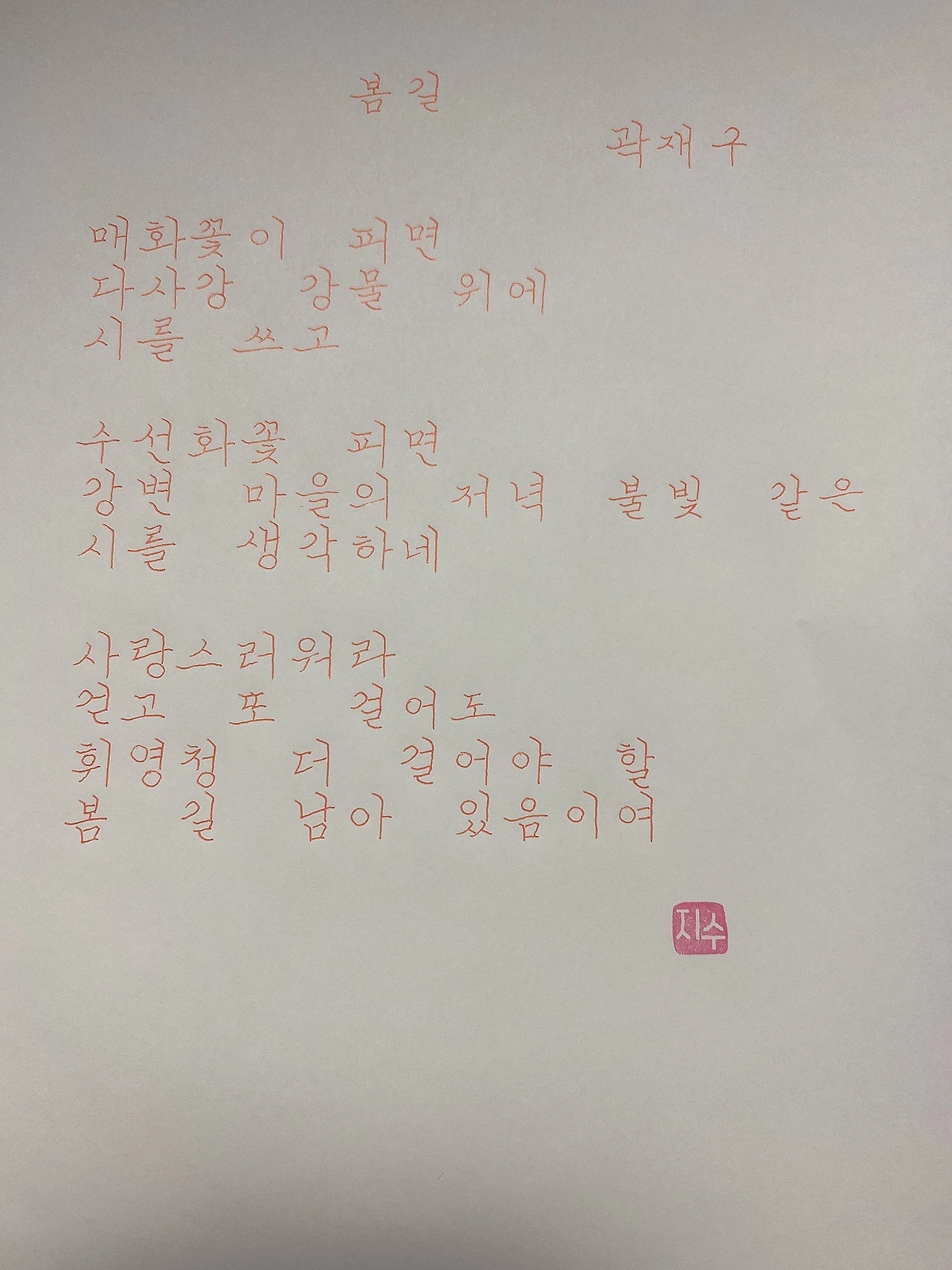 평범한 직장인. 사내 동호회를 통해 매일 한편 손으로 시 읽기를 시작한 이후로, 매일 시 한편을 필사 합니다. 필사한 시가 저작권에 문제가 된다면 말씀해주세요.