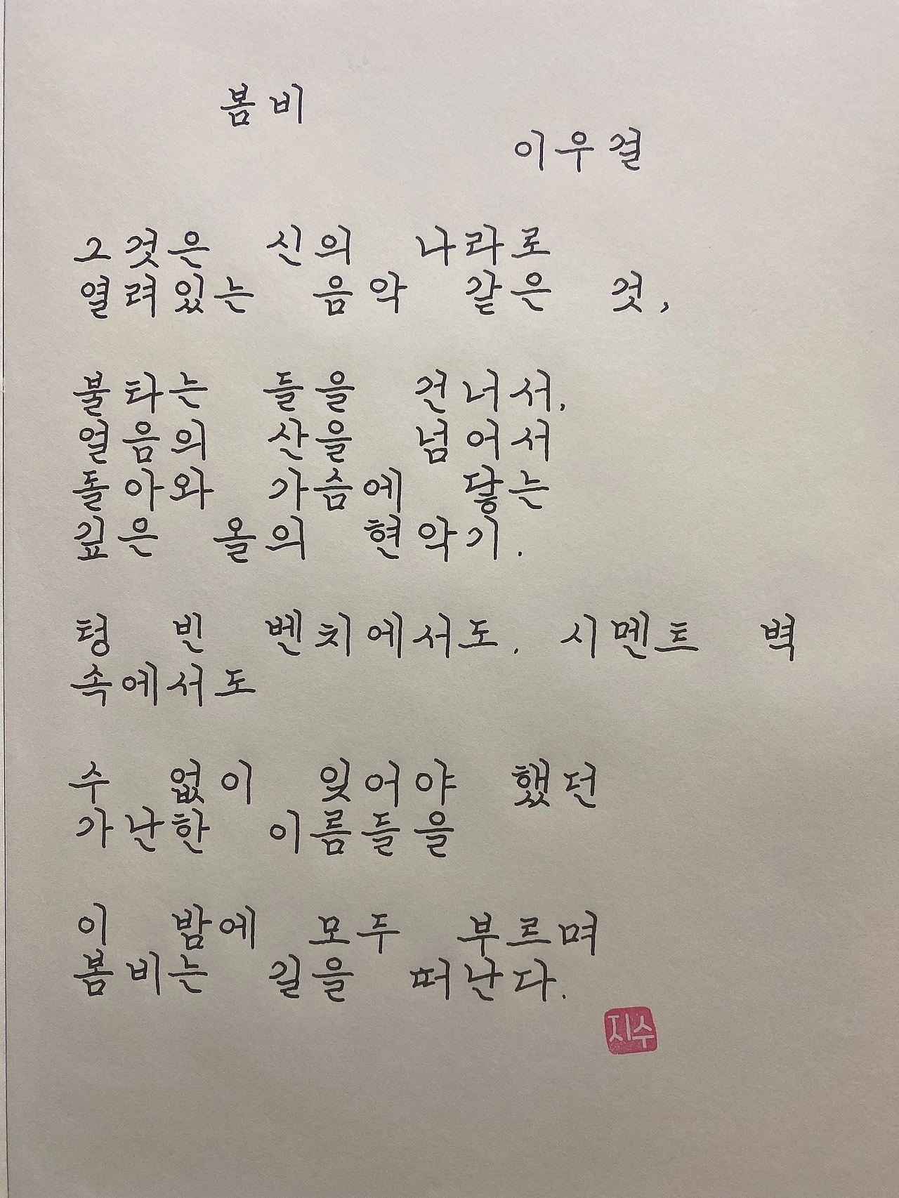 평범한 직장인. 사내 동호회를 통해 매일 한편 손으로 시 읽기를 시작한 이후로, 매일 시 한편을 필사 합니다. 필사한 시가 저작권에 문제가 된다면 말씀해주세요.
