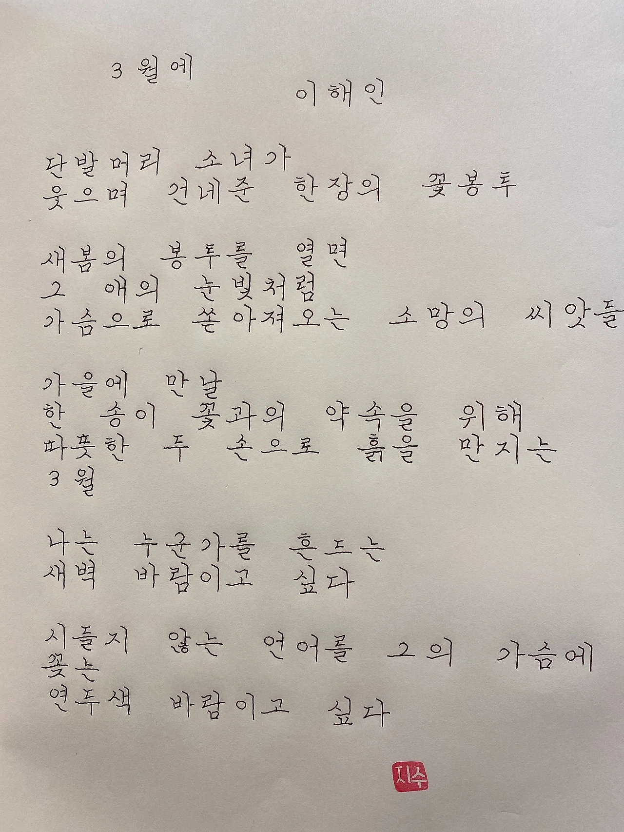 평범한 직장인. 사내 동호회를 통해 매일 한편 손으로 시 읽기를 시작한 이후로, 매일 시 한편을 필사 합니다. 필사한 시가 저작권에 문제가 된다면 말씀해주세요.