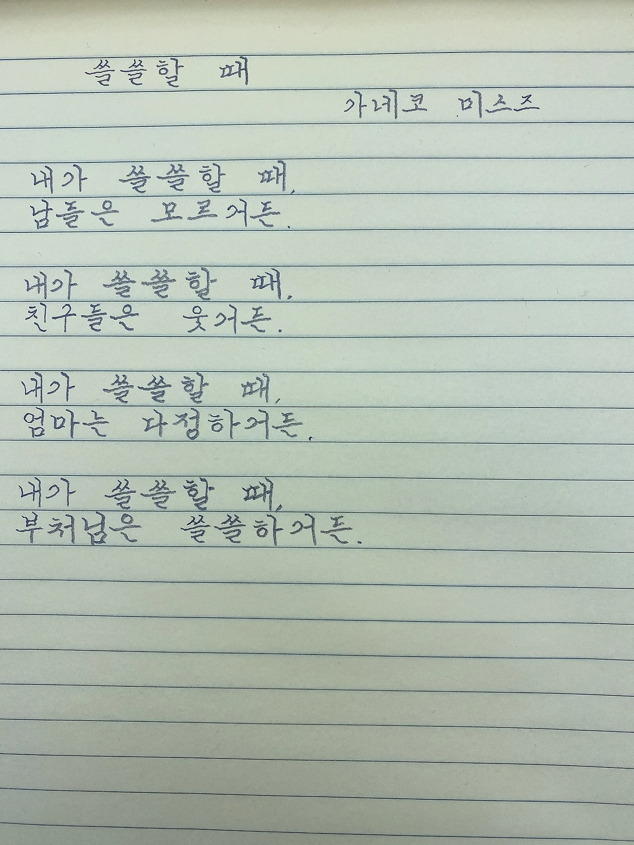 평범한 직장인. 사내 동호회를 통해 매일 한편 손으로 시 읽기를 시작한 이후로, 매일 시 한편을 필사 합니다. 필사한 시가 저작권에 문제가 된다면 말씀해주세요.