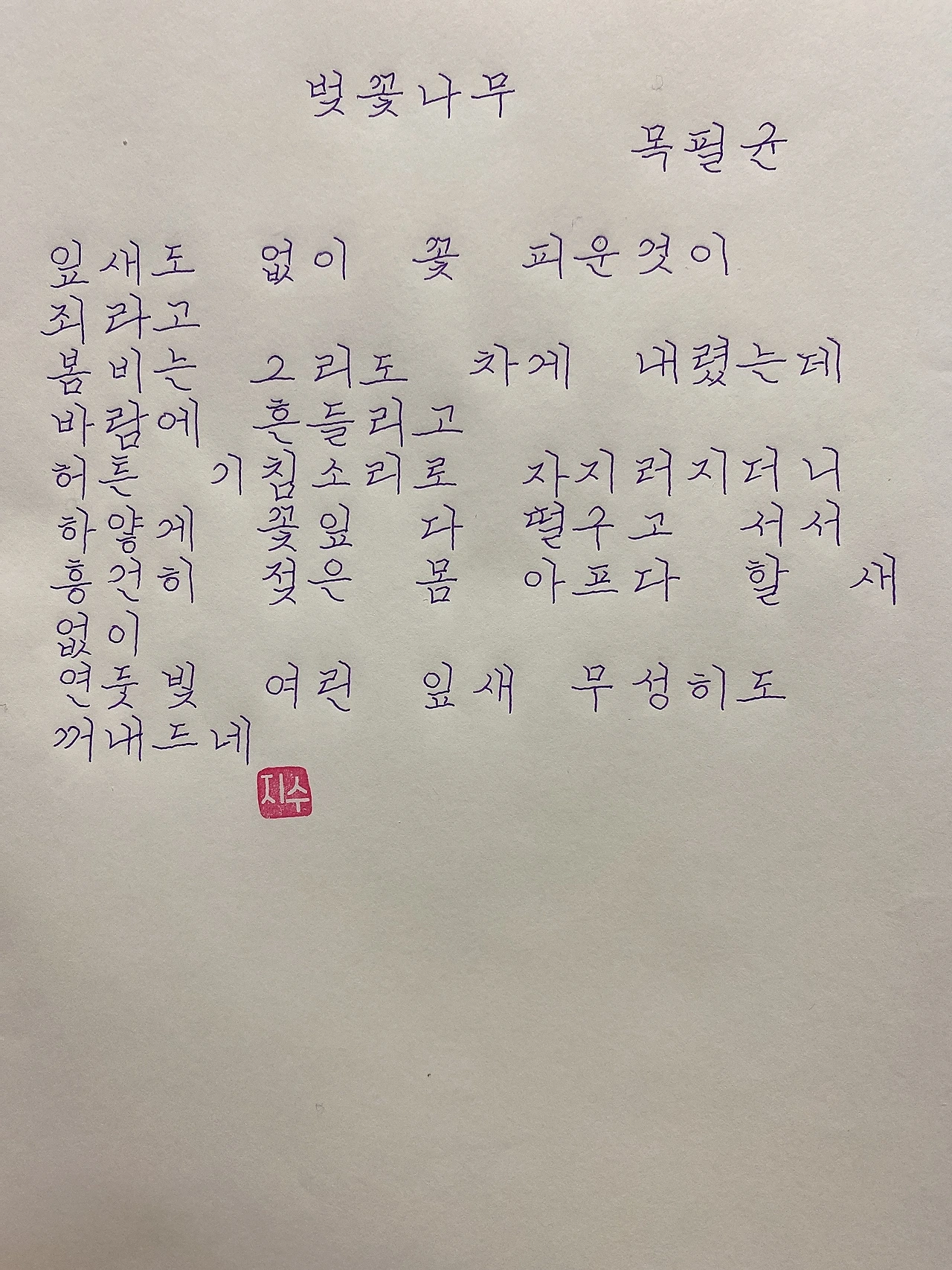 평범한 직장인. 사내 동호회를 통해 매일 한편 손으로 시 읽기를 시작한 이후로, 매일 시 한편을 필사 합니다. 필사한 시가 저작권에 문제가 된다면 말씀해주세요.