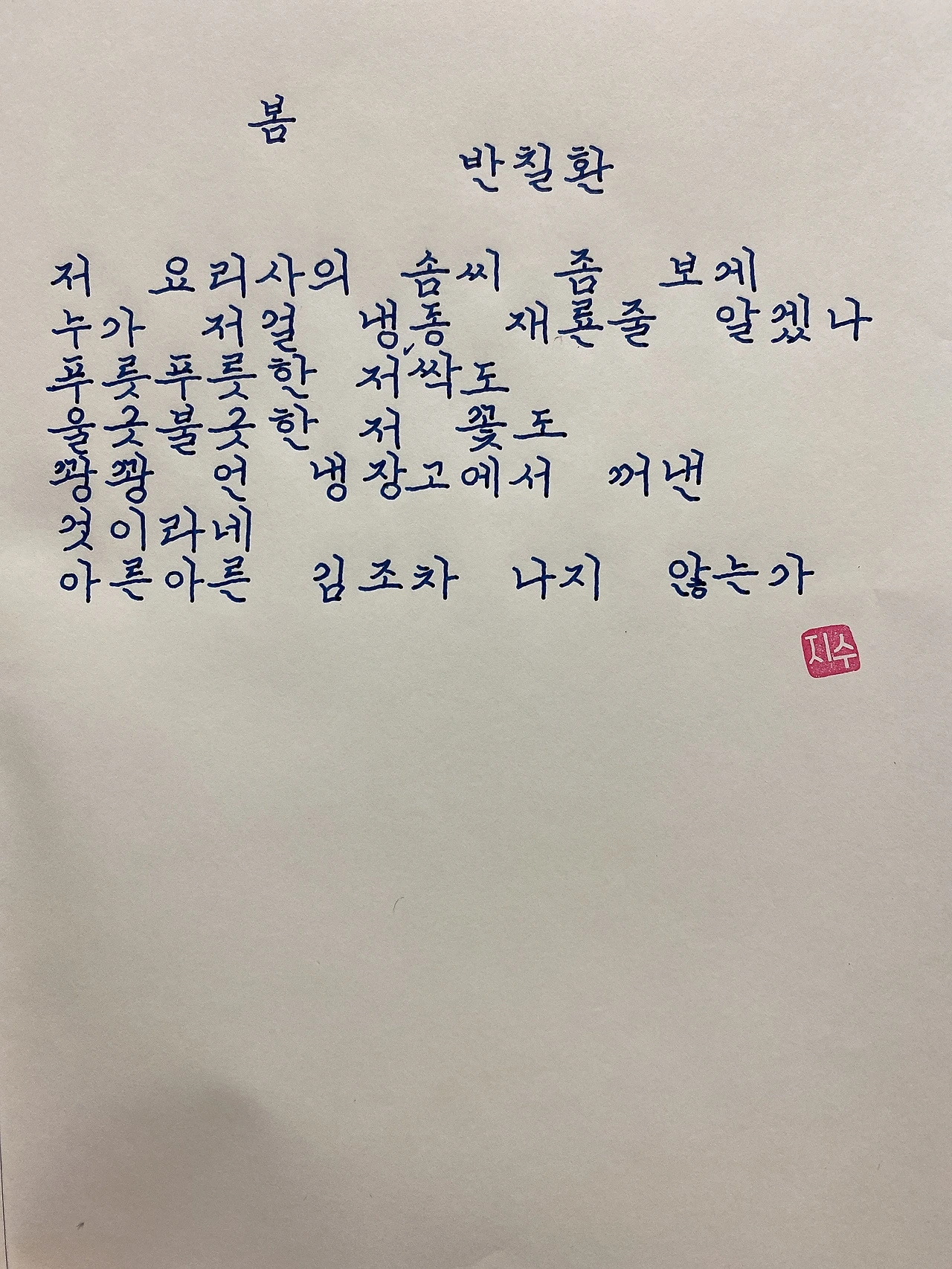 평범한 직장인. 사내 동호회를 통해 매일 한편 손으로 시 읽기를 시작한 이후로, 매일 시 한편을 필사 합니다. 필사한 시가 저작권에 문제가 된다면 말씀해주세요.
