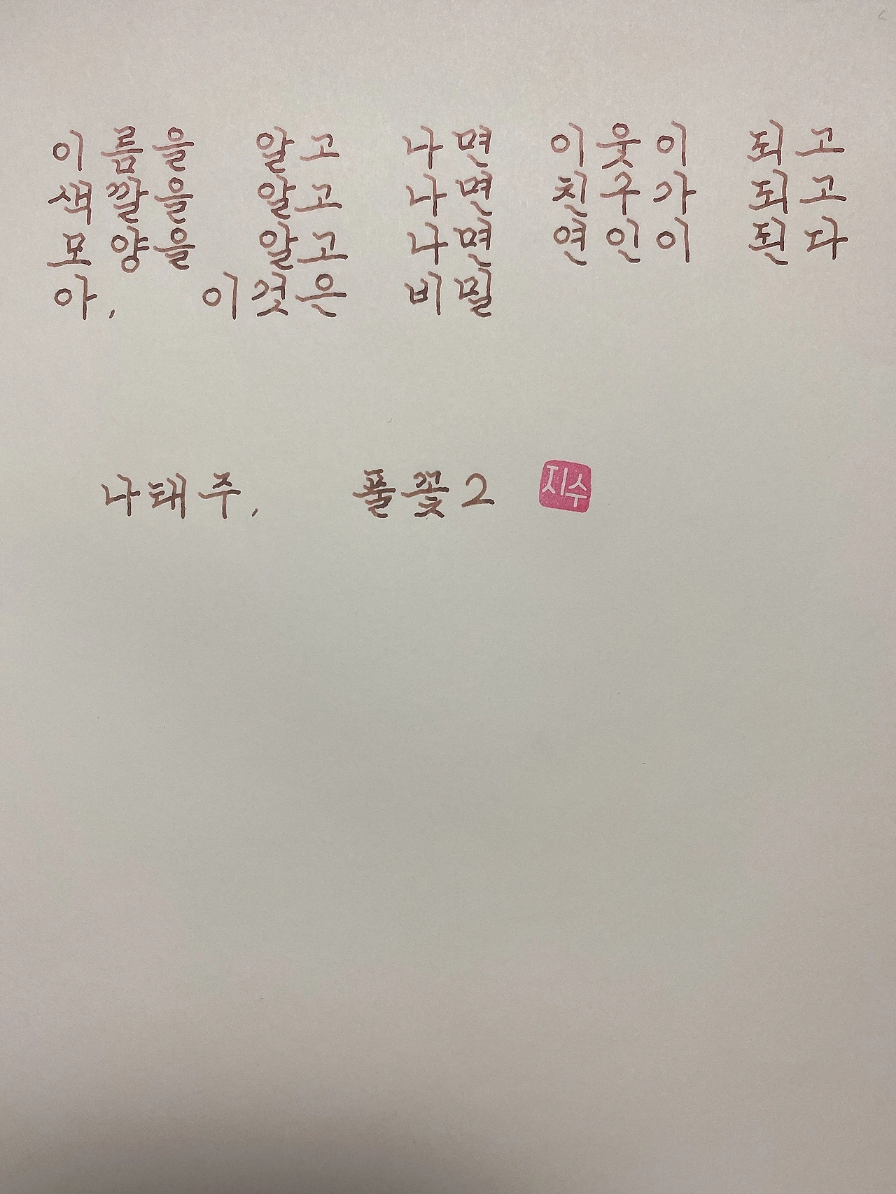 평범한 직장인. 사내 동호회를 통해 매일 한편 손으로 시 읽기를 시작한 이후로, 매일 시 한편을 필사 합니다. 필사한 시가 저작권에 문제가 된다면 말씀해주세요.