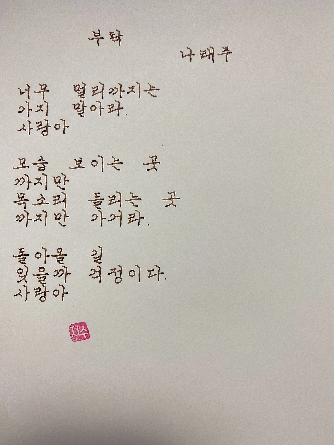 평범한 직장인. 사내 동호회를 통해 매일 한편 손으로 시 읽기를 시작한 이후로, 매일 시 한편을 필사 합니다. 필사한 시가 저작권에 문제가 된다면 말씀해주세요.
