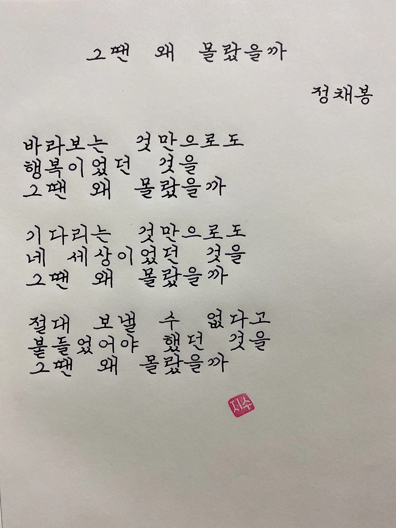 평범한 직장인. 사내 동호회를 통해 매일 한편 손으로 시 읽기를 시작한 이후로, 매일 시 한편을 필사 합니다. 필사한 시가 저작권에 문제가 된다면 말씀해주세요.