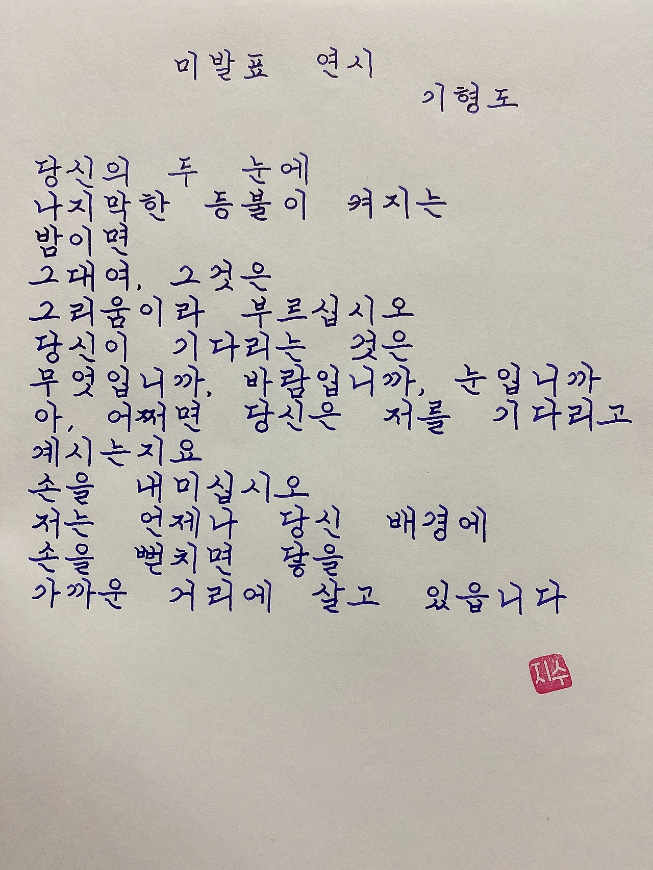 평범한 직장인. 사내 동호회를 통해 매일 한편 손으로 시 읽기를 시작한 이후로, 매일 시 한편을 필사 합니다. 필사한 시가 저작권에 문제가 된다면 말씀해주세요.