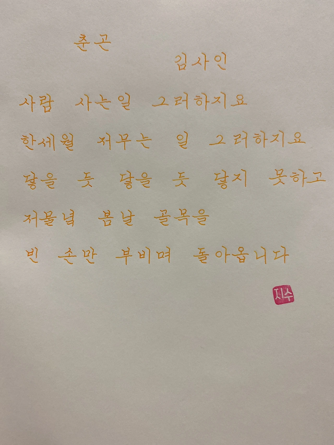 평범한 직장인. 사내 동호회를 통해 매일 한편 손으로 시 읽기를 시작한 이후로, 매일 시 한편을 필사 합니다. 필사한 시가 저작권에 문제가 된다면 말씀해주세요.