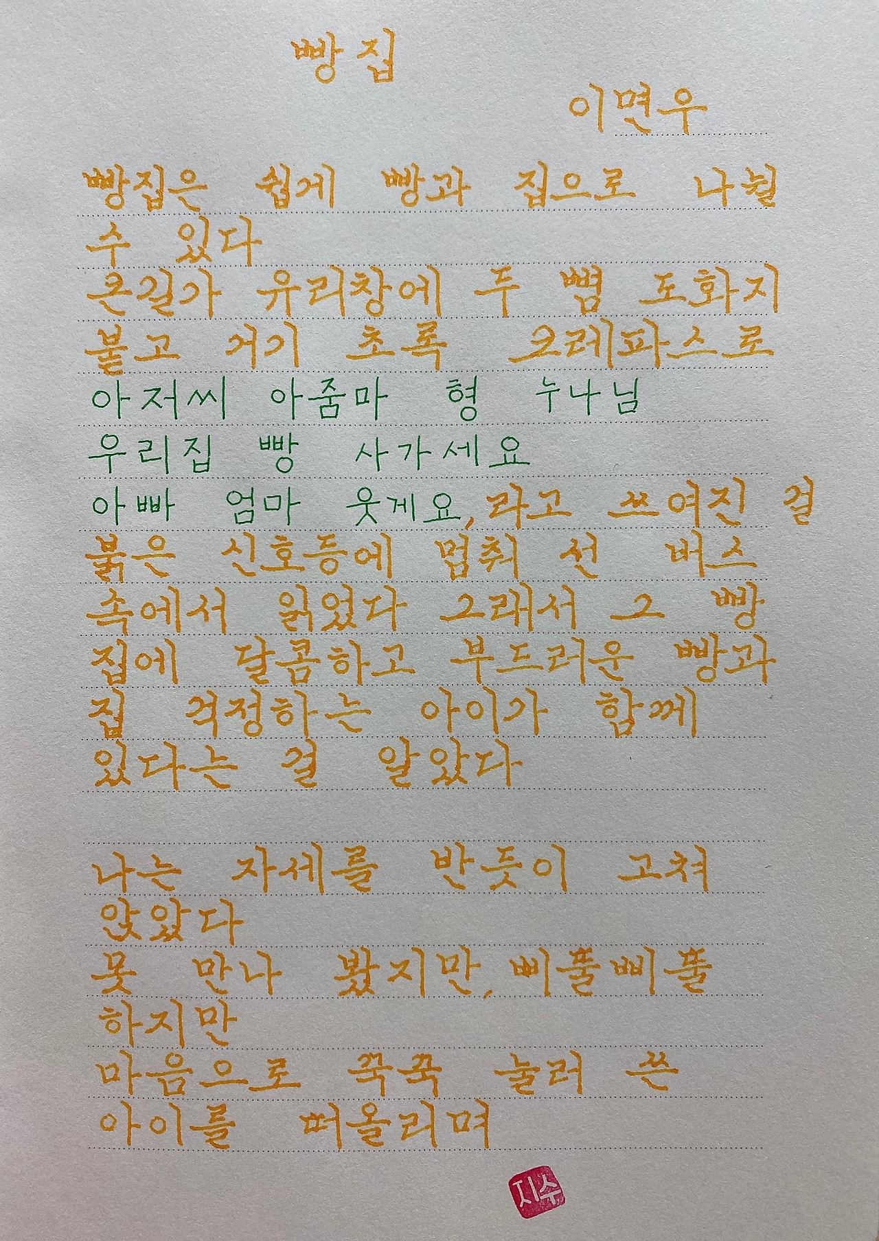 평범한 직장인. 사내 동호회를 통해 매일 한편 손으로 시 읽기를 시작한 이후로, 매일 시 한편을 필사 합니다. 필사한 시가 저작권에 문제가 된다면 말씀해주세요.