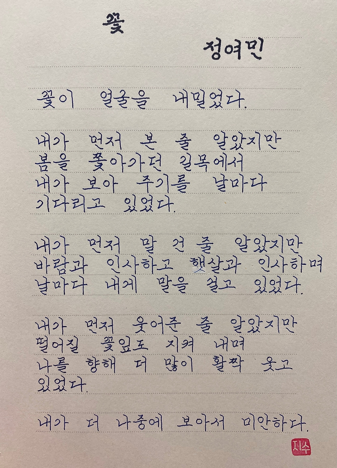 평범한 직장인. 사내 동호회를 통해 매일 한편 손으로 시 읽기를 시작한 이후로, 매일 시 한편을 필사 합니다. 필사한 시가 저작권에 문제가 된다면 말씀해주세요.