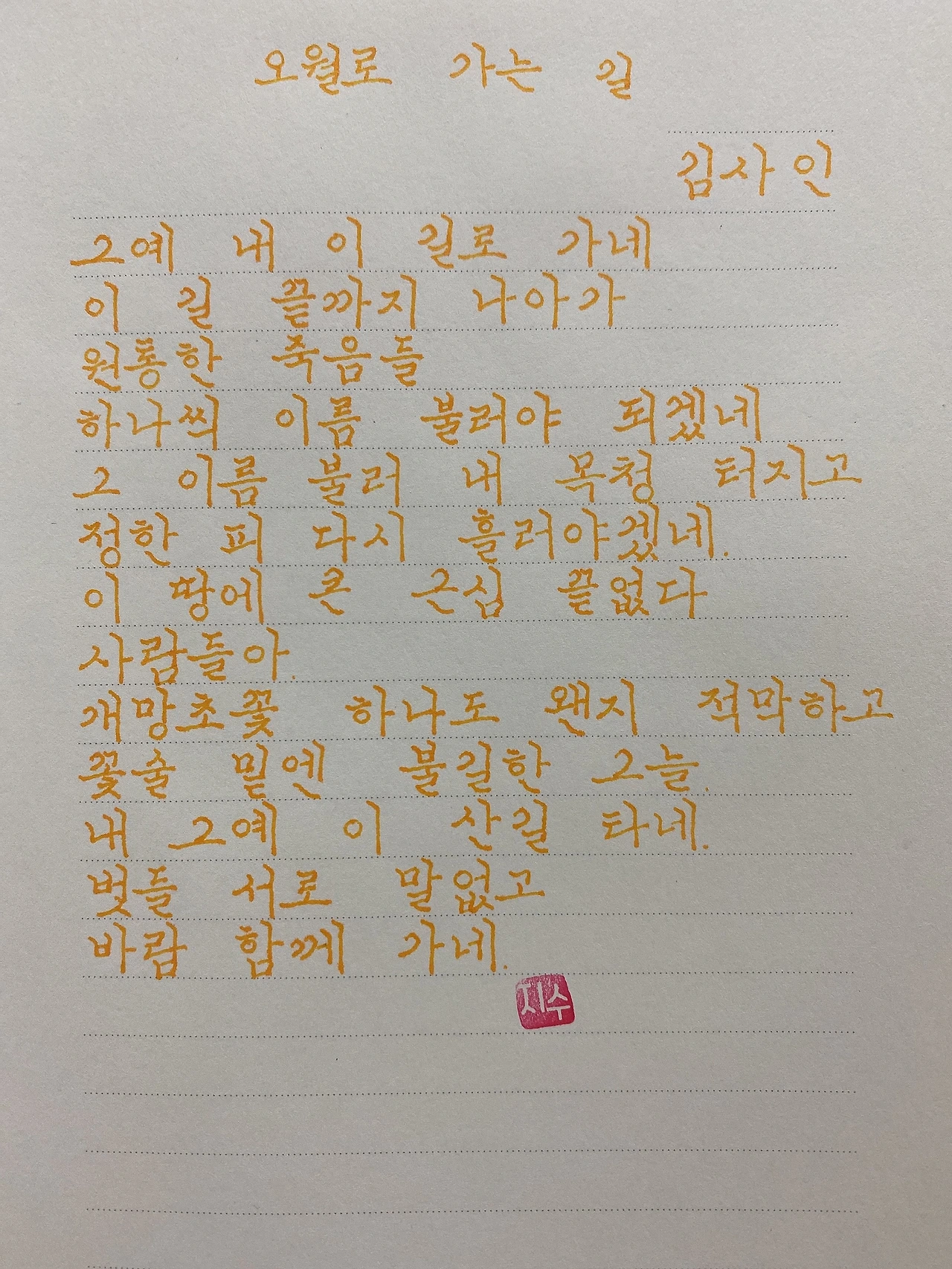 평범한 직장인. 사내 동호회를 통해 매일 한편 손으로 시 읽기를 시작한 이후로, 매일 시 한편을 필사 합니다. 필사한 시가 저작권에 문제가 된다면 말씀해주세요.