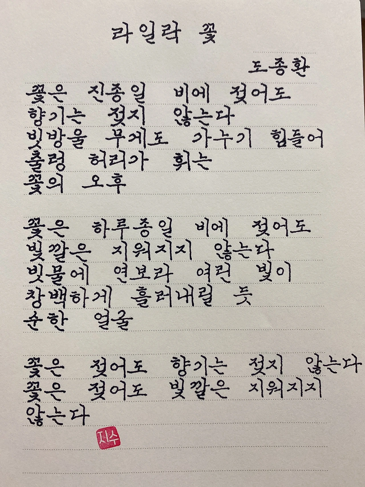 평범한 직장인. 사내 동호회를 통해 매일 한편 손으로 시 읽기를 시작한 이후로, 매일 시 한편을 필사 합니다. 필사한 시가 저작권에 문제가 된다면 말씀해주세요.