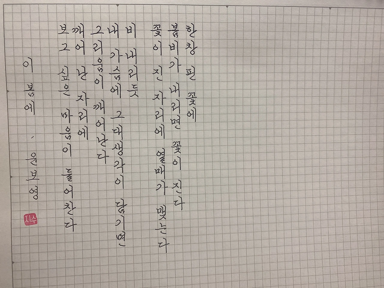 평범한 직장인. 사내 동호회를 통해 매일 한편 손으로 시 읽기를 시작한 이후로, 매일 시 한편을 필사 합니다. 필사한 시가 저작권에 문제가 된다면 말씀해주세요.