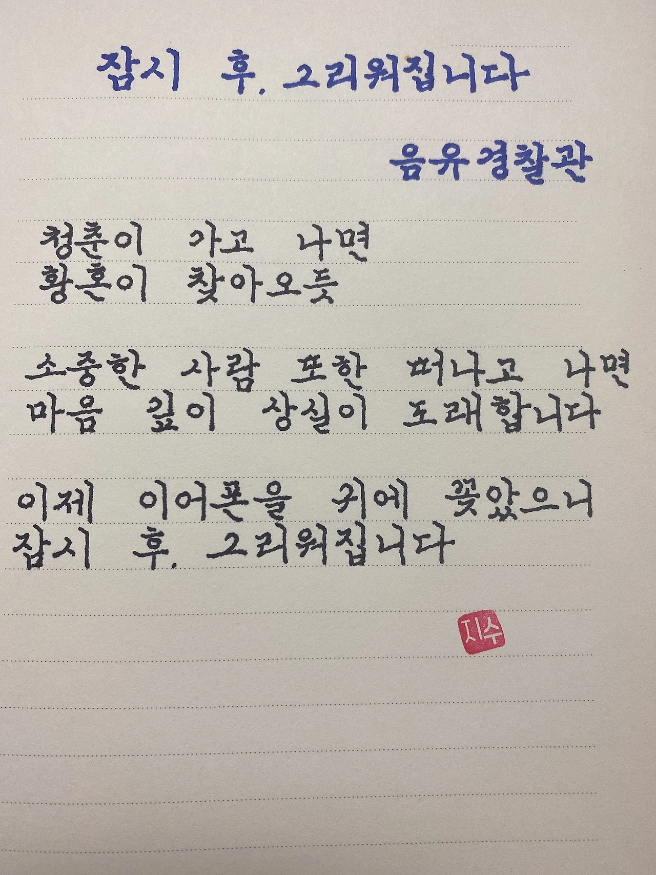 평범한 직장인. 사내 동호회를 통해 매일 한편 손으로 시 읽기를 시작한 이후로, 매일 시 한편을 필사 합니다. 필사한 시가 저작권에 문제가 된다면 말씀해주세요.