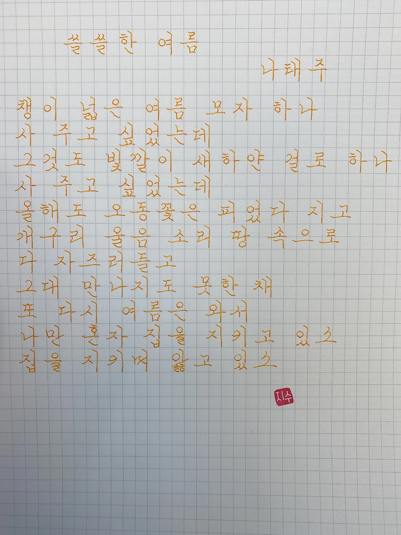 평범한 직장인. 사내 동호회를 통해 매일 한편 손으로 시 읽기를 시작한 이후로, 매일 시 한편을 필사 합니다. 필사한 시가 저작권에 문제가 된다면 말씀해주세요.