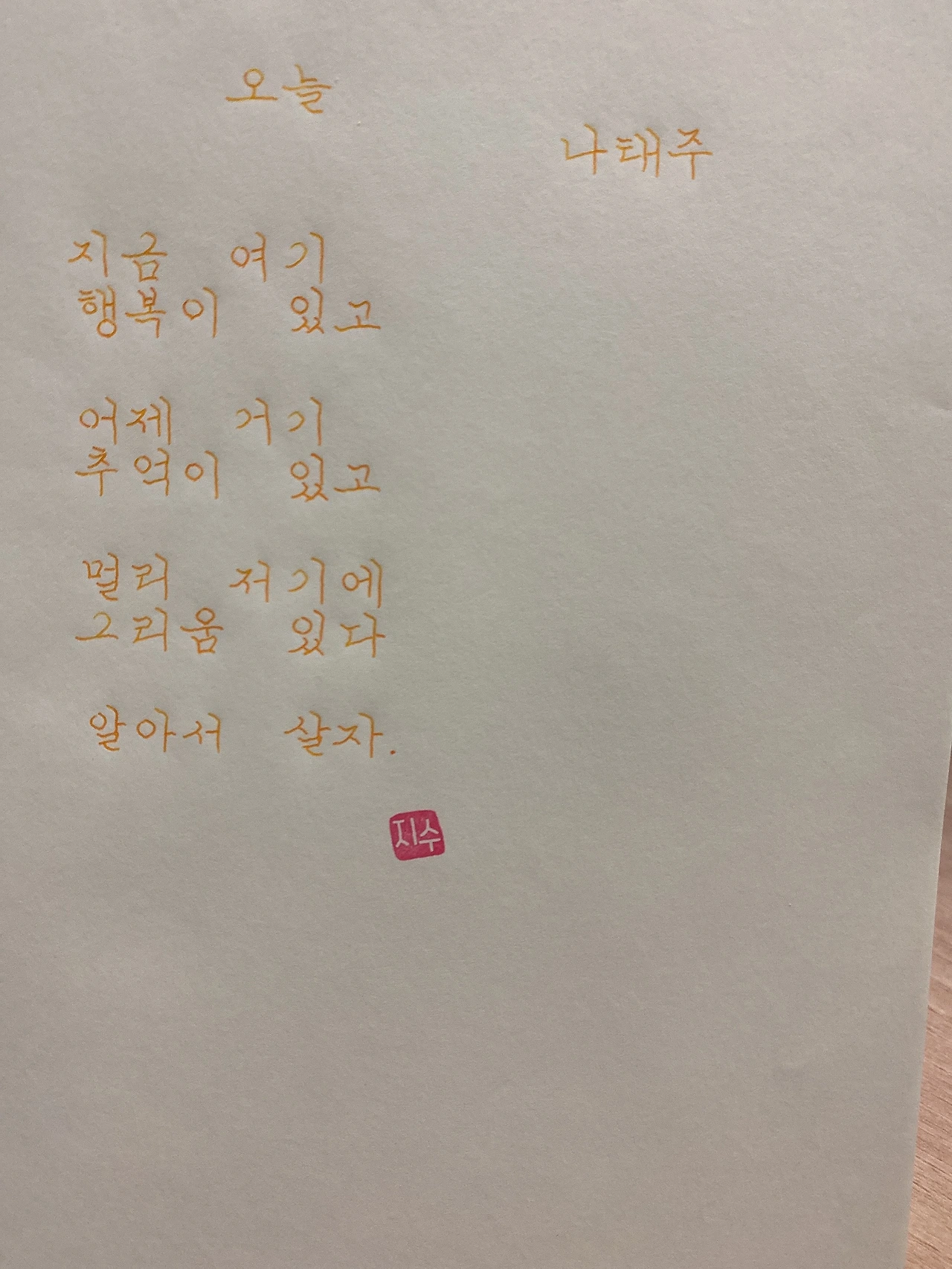 평범한 직장인. 사내 동호회를 통해 매일 한편 손으로 시 읽기를 시작한 이후로, 매일 시 한편을 필사 합니다. 필사한 시가 저작권에 문제가 된다면 말씀해주세요.
