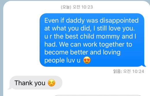 딸은 그날 저녁 내 핸드폰에다 가상의 나랑 자신의 대화를 적어놨다. 처음에는 이게 뭔가 해서 아내에게 물어보니 아내 왈 아무래도 딸이 잘못을 했음에도 아빠가 여전히 자신을 사랑하는지 알고 싶어서 적은 것 같으니 나보고 화답을 하라고 한다.