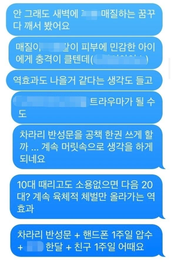 곤장 대신 반성문 쓰기와 핸드폰으로 대체해보니 내 마음이 좀 더 가볍다. 다시 자면서 다시 혼내는 꿈을 꿨지만 꿈에서도 마음이 덜 무겁다.