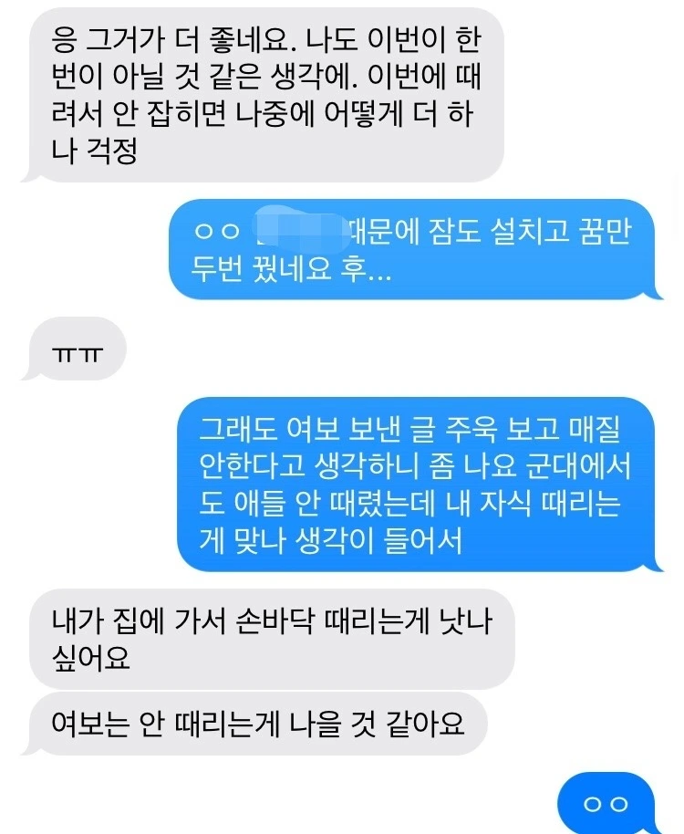 일단 난 자고 있는 애들 옆에 누었다. 아무래도 잠이 안 온다. 군대에서도 부하를 안 때리겠다고 다짐하고 한 번도 안 때렸는데 차마 내 딸을 곤장을 치는 게 앞뒤가 안 맞는다. 스스로 내 원칙을 깨는 거 같다. 그리고 일단 곤장을 치면 돌이킬 수가 없다. 게다가 곤장 치는 꿈까지 직전에 꿨으니... 난 새벽에 일어나서 아내에게 다시 문자를 보냈다.