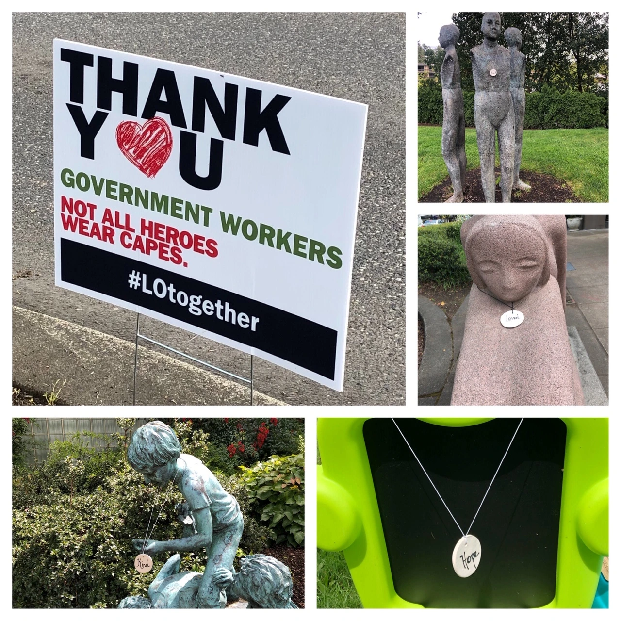 미국을 받춰주는 또 하나의 한 축은 일반 미국인들의 커뮤니티에 대한 (국민의 반은 대통령과 정부 욕을 하면서도) 애정과 지지이다. 위기가 닥치면 대체적으로 미국인들은 정부의 shelter-in-place 등의 강력한 제재에 대해서 잘 순응하는(이 와중에 일부 미국인들은 총과 총알라도 많이 사놓지만) 한편, 일반 미국인들은 초동대응요원(First Responders - 경찰, 의료진 등)과 슈퍼마켓 직원 등에 대한 지지를 보낸다. 그리고 서로 힘을 내자라는 의미로 시내 곳곳에 아래 사진과 같은 메세지를 걸어놓았다. 우리 가족이 동네 산책을 하다보면 어느 한 주택은 매번 응원의 메시지가 바뀌어 있다(빗자리 길이만큼 사회적 거리두기하자하는 의미로 빗자루를 옆으로 놔둠).