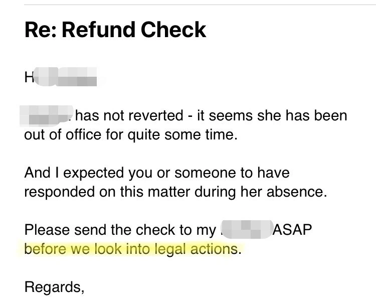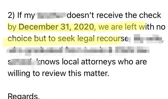 난 2주를 기다렸다가 더 강한 톤의 이메일을 보냈다. 이번엔 올해 말까지 안 보내면 법적 조치를 할 것이고 그 동네 변호사들을 잘 알고 있다고 했다.