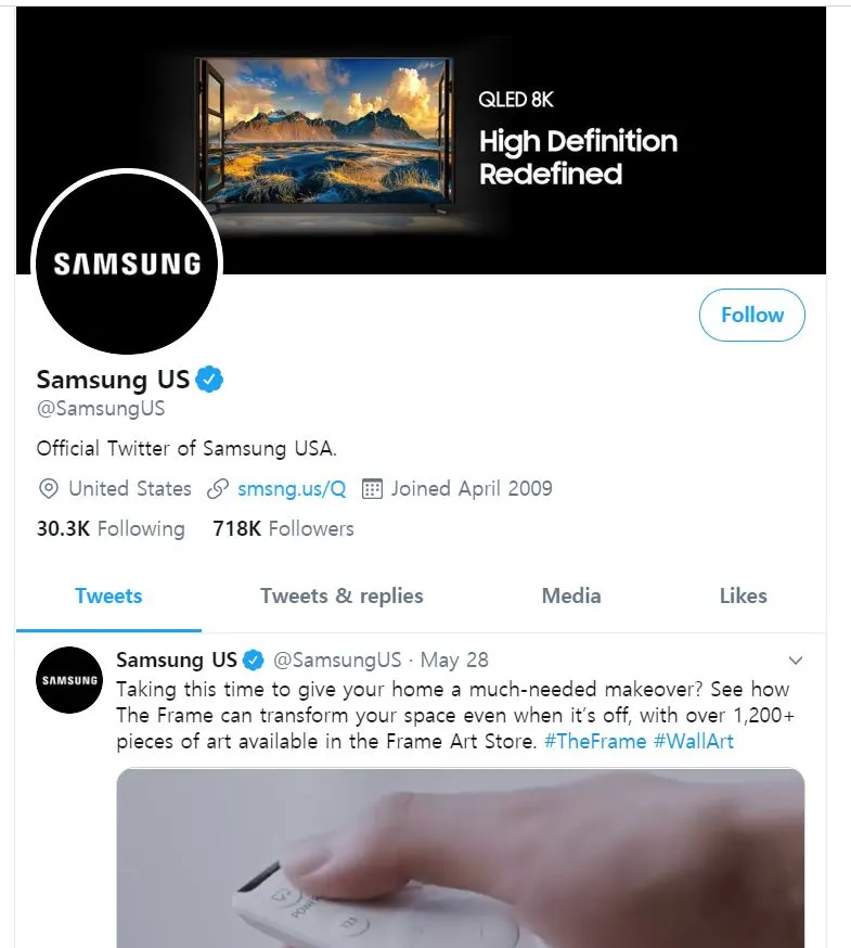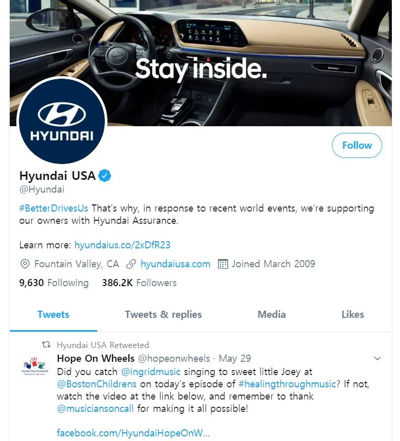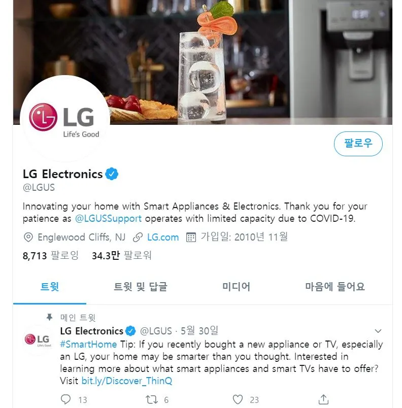 아래는 LG전자 미주 트위터, 현대자동차 미주 트위터, 삼성전자 미주 트위터는 5월 말 이후 업데이트가 되어 있지 않다(2020. 6. 7. 기준).