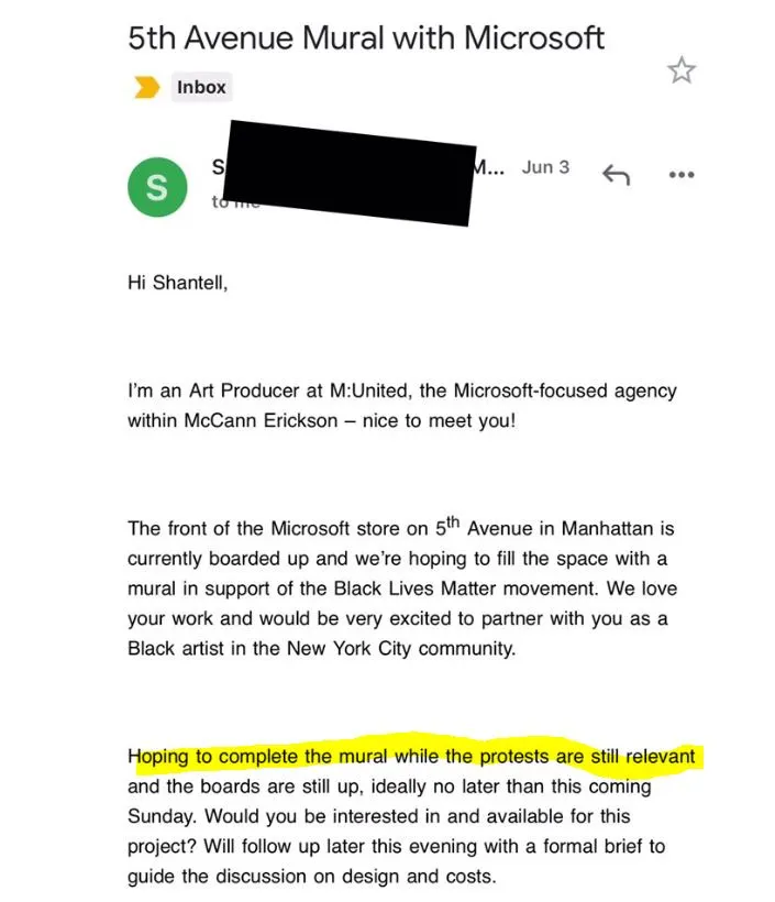 한편, 일부 기업들은 지지 선언만 하고 기부에 대해서는 아무 말이 없거나, 부적절한 지지 표명을 하여 소비자들에게 되려 반발을 사는 경우가 있다. 마이크로소프트의 경우, 흑인 화가 Shantell Martin에게 Black Lives Matter 벽화를 6월 7일까지 완성해달라고 했다. 마이크로소프트는 이렇게 기한을 잡은 이유는 이 날 이후에는 이 운동이 의미가 없을 것이기 때문이라고 했다. 이 화가는 이 부적절한 내용의 이메일을 본인 트위터에 올렸고, 논란이 되자 마이크로소프트는 즉각 사과를 하였다. 아래는 문제의 마이크로소프트 이메일.