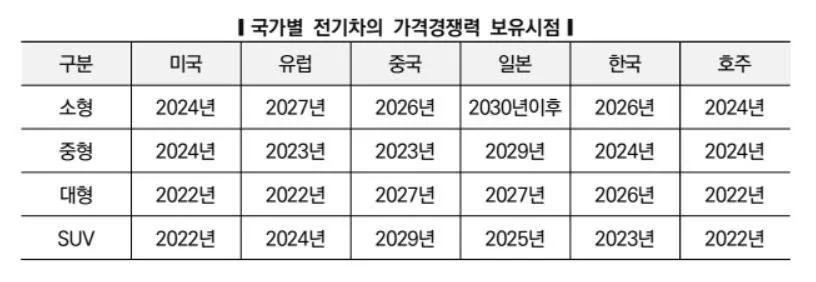 다만 동급 내연기관차와 가격이 비슷해진 시점은 차종마다 다르다. 블룸버그NEF 보고서에 따르면 전기차가 대중화되는 시점은 차종마다 다르다고 한다. 전기차 SUV가 가장 빠르게 내연기관 SUV와 2년 후 비슷해진다.