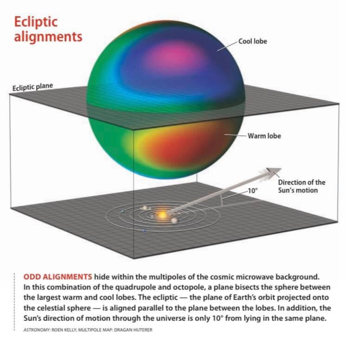 지구는 특별하지 않다는 코페르니쿠스 원리와 다르게 놀랍게도 지구가 태양을 자전하는 궤도면이 우주배경복사에서 보여주는 상대적으로 따뜻한 부분과 상대적으로 차가운 부분을 구분하는 궤도면과 정렬된다고 한다(자세한 건 아래 그림 참고). 신기하고 기이하다.