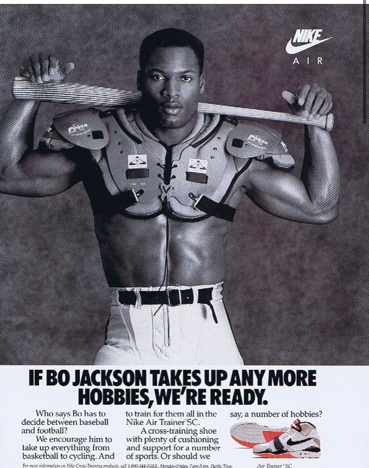 조던은 아버지가 살해당하고 일 년간 농구에서 은퇴하고 야구에 도전해본다. 그가 야구에서는 2군에서만 있었으니 사실 두 개의 스포츠를 모두 잘한 선수들이 내심 부러웠을 것이다. 그가 부러워할만한 선수는 특히 보 잭슨(캔자스 시티 로열즈/LA 레이더스). 보는 두 개의 스포츠에서 올스타로 선정됐었다. 생애 첫 1989년 야구 올스타 경기 선두타자로 나와 첫 타석에서 홈런을 때린다. 그리고 올스타 MVP 수상. 1990년에는 미식축구 올스타로도 뽑힌다. 하지만 몇 년 후 아쉽게도 부상을 당해 은퇴. 그가 유명해진 것은 1989년과 1990년 나이키의 “Bo Knows” 광고를 통해서 전 세계적으로 유명해졌고(심지어 올스타전에서 홈런을 치고 난 후 바로 방영해서 더 유명세를 탔다), 잠깐이나마 마이클 조던 광고 다음으로 가장 유명한 운동선수 광고였다.